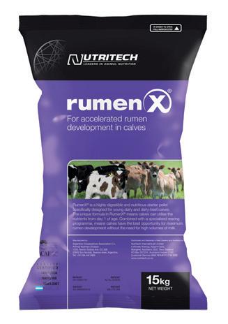 conventionally reared calves. Similar improvements in milksolids yields were recorded on these farms. Comparisons between RumenX and conventionally reared cows during later lactations showed the former group appearing to outperform the latter group during their second and third lactations. Calculations based on performance data also indicate the RumenX cows had improved lifetime performance. The high degradability of RumenX encourages early rumen development and its low density results in it being retained in the developing rumen longer, ensuring more is degraded. The restricted milk intake also encourages early intake of RumenX and subsequently calf meal, as the rumen develops rapidly. For further information, contact your Farmlands Technical Field Officer or the friendly team at your local Farmlands store.