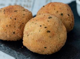 5. Wrap potato mix around frozen gravy cube. Then flour, egg and breadcrumb each to resemble a scotch egg.