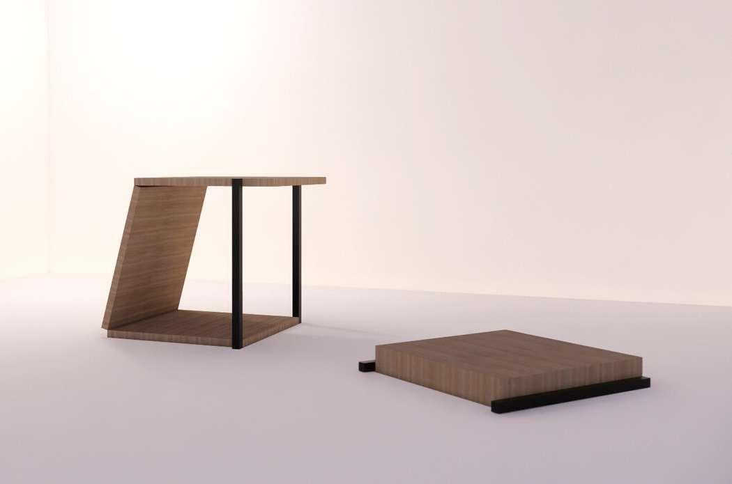 the design of this nightstand came off really simple and practical without any unnecessary ornaments. This squareshaped nightstand consists of three boards (one acts as the top table, one acts as the base, one acts as a "leg") and two iron poles that hold them up together while in use.