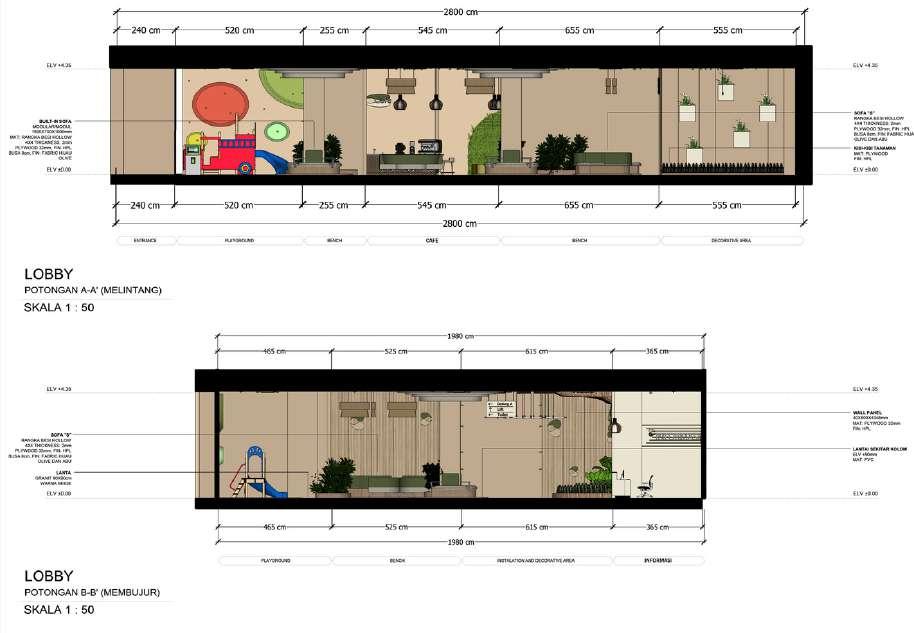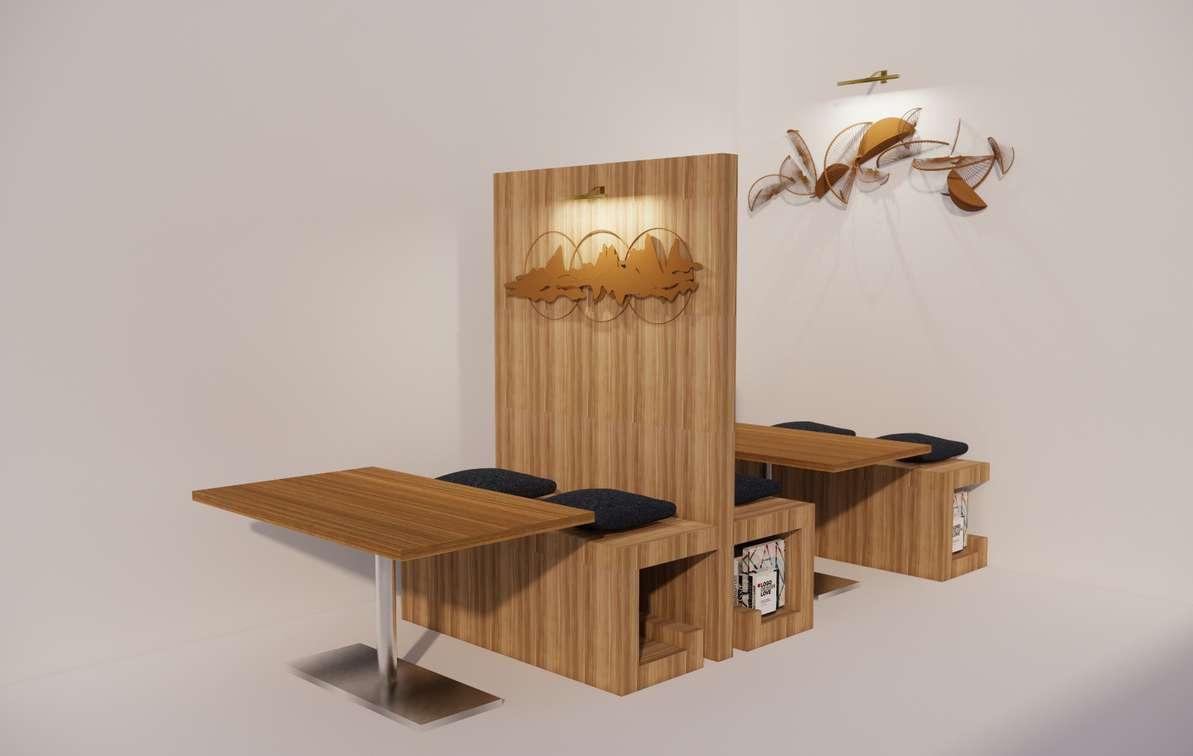 Hardwood plywood is used as the furniture's main material as it came off strong and easy to be shaped and built. With wood textured high pressure laminate (HPL) as the finishing that is applied to the surface to make it look sleek.