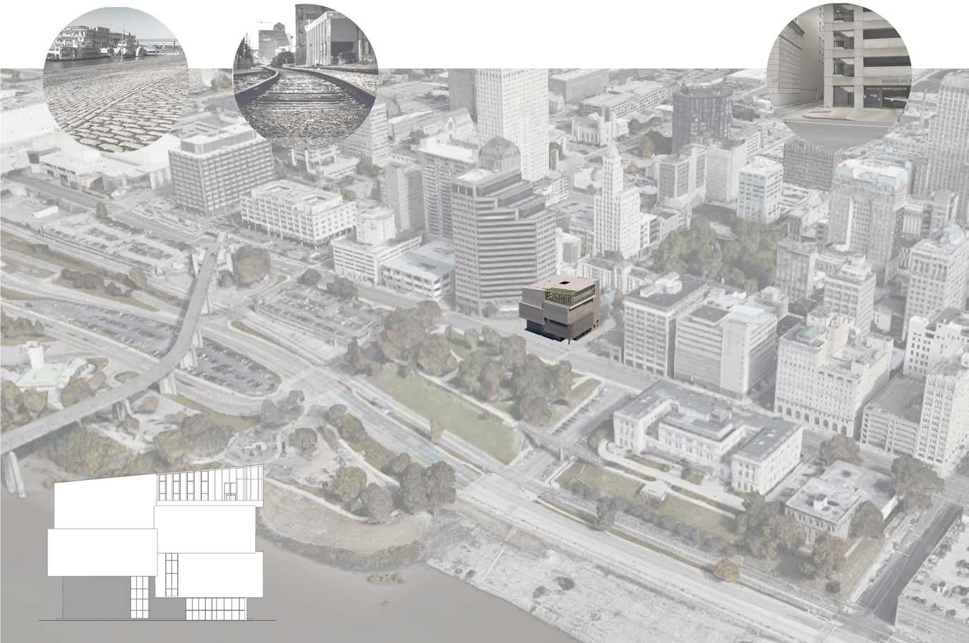 The site is located in Mud Island River Park in downtown Memphis. The existing buildings in the site include a museum and an amphitheater. In this project, the highschool is located at the existing location of the museum, and is connected to the amphitheater so that the school can take the advantage of the existing art performance area.