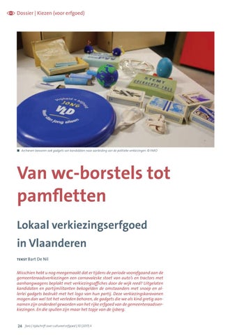 Van wc-borstels tot pamfletten Lokaal verkiezingserfgoed in Vlaanderen TEKST Bart De Nil Misschien hebt u nog meegemaakt dat er tijdens de periode voorafgaand aan de gemeenteraadsverkiezingen een carnavaleske stoet van auto’s en tractors met aanhangwagens beplakt met verkiezingsaffiches door de wijk reed? Uitgelaten kandidaten en partijmilitanten bekogelden de omstaanders met snoep en allerlei gadgets bedrukt met het logo van hun partij. Deze verkiezingskaravanen mogen dan wel tot het verleden behoren, de gadgets die we als kind gretig aannamen zijn onderdeel geworden van het rijke erfgoed van de gemeenteraadsverkiezingen. En die spullen zijn maar het topje van de ijsberg.