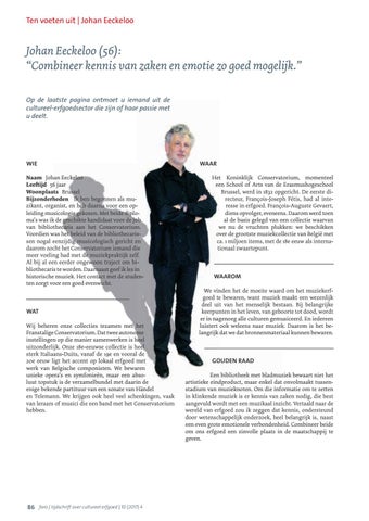 Johan Eeckeloo (56): “Combineer kennis van zaken en emotie zo goed mogelijk.” Op de laatste pagina ontmoet u iemand uit de cultureel-erfgoedsector die zijn of haar passie met u deelt.