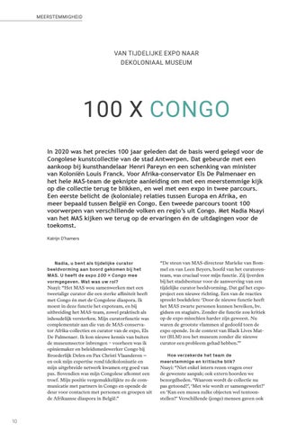 100 X CONGO In 2020 was het precies 100 jaar geleden dat de basis werd gelegd voor de Congolese kunstcollectie van de stad Antwerpen. Dat gebeurde met een aankoop bij kunsthandelaar Henri Pareyn en een schenking van minister van Koloniën Louis Franck. Voor Afrika-conservator Els De Palmenaer en het hele MAS-team de geknipte aanleiding om met een meerstemmige kijk op die collectie terug te blikken, en wel met een expo in twee parcours. Een eerste belicht de (koloniale) relaties tussen Europa en Afrika, en meer bepaald tussen België en Congo. Een tweede parcours toont 100 voorwerpen van verschillende volken en regio’s uit Congo. Met Nadia Nsayi van het MAS kijken we terug op de ervaringen én de uitdagingen voor de toekomst. Katrijn D’hamers