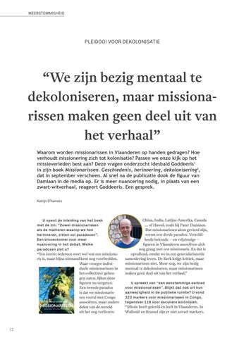 “We zijn bezig mentaal te dekoloniseren, maar missionarissen maken geen deel uit van het verhaal” Waarom worden missionarissen in Vlaanderen op handen gedragen? Hoe verhoudt missionering zich tot kolonisatie? Passen we onze kijk op het missieverleden best aan? Deze vragen onderzocht Idesbald Goddeeris1 in zijn boek Missionarissen. Geschiedenis, herinnering, dekolonisering2, dat in september verscheen. Al snel na de publicatie dook de figuur van Damiaan in de media op. Er is meer nuancering nodig, in plaats van een zwart-witverhaal, reageert Goddeeris. Een gesprek. Katrijn D’hamers