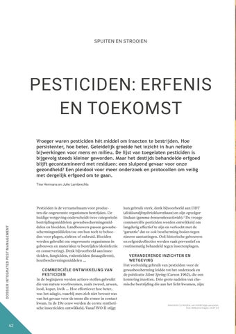 PESTICIDEN: ERFENIS EN TOEKOMST Vroeger waren pesticiden hét middel om insecten te bestrijden. Hoe persistenter, hoe beter. Geleidelijk groeide het inzicht in hun nefaste bijwerkingen voor mens en milieu. De lijst van toegelaten pesticiden is bijgevolg steeds kleiner geworden. Maar het destijds behandelde erfgoed blijft gecontamineerd met residuen: een sluipend gevaar voor onze gezondheid? Een pleidooi voor meer onderzoek en protocollen om veilig met dergelijk erfgoed om te gaan.