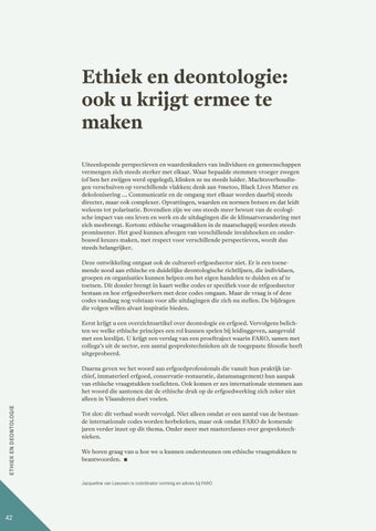 Ethiek en deontologie: ook u krijgt ermee te maken Uiteenlopende perspectieven en waardenkaders van individuen en gemeenschappen vermengen zich steeds sterker met elkaar. Waar bepaalde stemmen vroeger zwegen (of hen het zwijgen werd opgelegd), klinken ze nu steeds luider. Machtsverhoudingen verschuiven op verschillende vlakken; denk aan #metoo, Black Lives Matter en dekolonisering … Communicatie en de omgang met elkaar worden daarbij steeds directer, maar ook complexer. Opvattingen, waarden en normen botsen en dat leidt weleens tot polarisatie. Bovendien zijn we ons steeds meer bewust van de ecologische impact van ons leven en werk en de uitdagingen die de klimaatverandering met zich meebrengt. Kortom: ethische vraagstukken in de maatschappij worden steeds prominenter. Het goed kunnen afwegen van verschillende invalshoeken en onderbouwd keuzes maken, met respect voor verschillende perspectieven, wordt dus steeds belangrijker. Deze ontwikkeling ontgaat ook de cultureel-erfgoedsector niet. Er is een toenemende nood aan ethische en duidelijke deontologische richtlijnen, die individuen, groepen en organisaties kunnen helpen om het eigen handelen te duiden en af te toetsen. Dit dossier brengt in kaart welke codes er specifiek voor de erfgoedsector bestaan en hoe erfgoedwerkers met deze codes omgaan. Maar de vraag is of deze codes vandaag nog volstaan voor alle uitdagingen die zich nu stellen. De bijdragen die volgen willen alvast inspiratie bieden. Eerst krijgt u een overzichtsartikel over deontologie en erfgoed. Vervolgens belichten we welke ethische principes een rol kunnen spelen bij leidinggeven, aangevuld met een leeslijst. U krijgt een verslag van een proeftraject waarin FARO, samen met collega’s uit de sector, een aantal gesprekstechnieken uit de toegepaste filosofie heeft uitgeprobeerd.