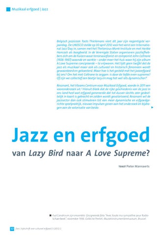 Belgisch jazzicoon Toots Thielemans viert dit jaar zijn negentigste verjaardag. De UNESCO stelde op 30 april 2012 voor het eerst een International Jazz Day in, samen met het Thelonious Monk Institute en met Herbie Hancock als boegbeeld. In de Verenigde Staten organiseren jazzliefhebbers zich om de huizen waar tenorsaxofonist en componist John Coltrane (1926-1967) woonde en werkte – onder meer het huis waar hij zijn album A Love Supreme concipieerde – te vrijwaren. Het lijdt geen twijfel dat de jazz als muzikaal maar ook als cultureel en historisch fenomeen wordt gewaardeerd en gekoesterd. Maar hoe is het gesteld met het jazzerfgoed bij ons? Om het met Coltrane te zeggen: is daar de liefde even supreme? Of zijn we collectief een beetje lazy en mag het wel iets dynamischer?1 Resonant, het Vlaams Centrum voor Muzikaal Erfgoed, voerde in 2011 een vooronderzoek uit.2 Hieruit bleek dat de rijke geschiedenis van de jazz in ons land heel wat erfgoed genereerde dat tot dusver slechts zeer gedeeltelijk in kaart is gebracht en zelden wordt gevaloriseerd. Resonant wil de jazzsector dan ook stimuleren tot een meer dynamische en erfgoedgerichte speelpraktijk, nieuwe impulsen geven aan het onderzoek en bijdragen aan de valorisatie van beide.