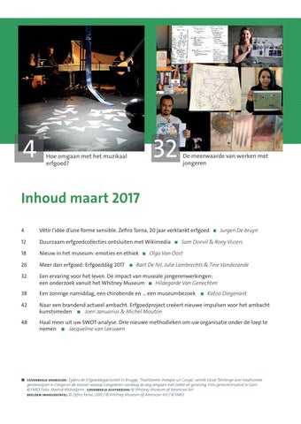 ■■ coverbeeld voorzijde: Tijdens de Erfgoeddagactiviteit in Brugge, ‘Traditionele therapie uit Congo’, vertelt Oscar Tshitenge over traditionele geneeswijzen in Congo en de manier waarop Congolezen vandaag de dag omgaan met ziekte en genezing. Foto gereconstrueerd in Gent. © FARO. Foto: Mashid Mohadjerin coverbeeld achterzijde: © Whitney Museum of American Art beelden inhoudstafel: © Zefiro Torna, 2010 / © Whitney Museum of American Art / © FARO