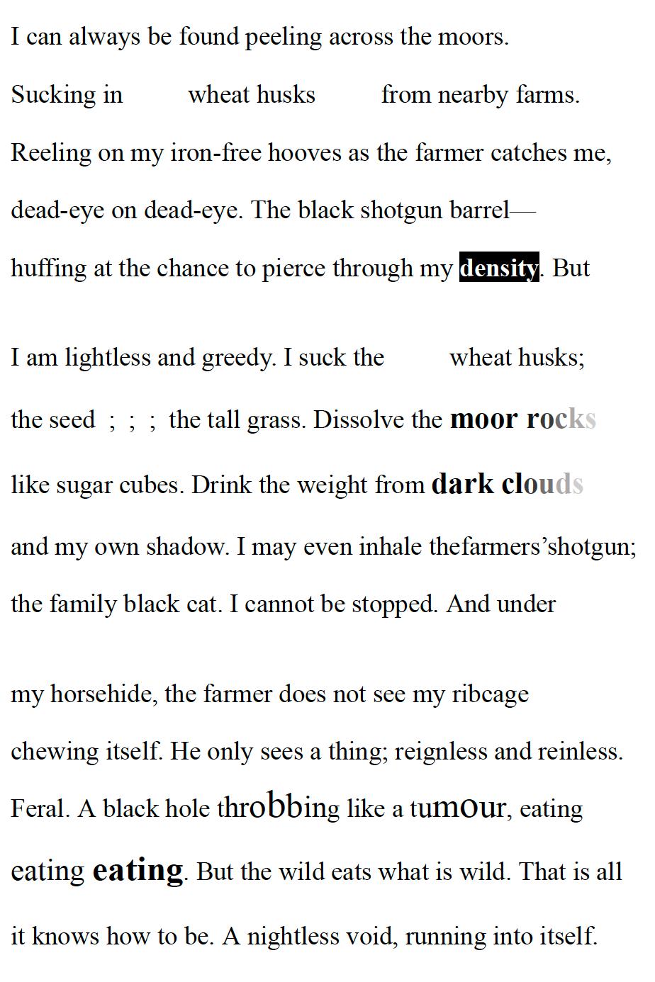 reached my hands out. Nearly there. Unghhhhh! I burst out from the darkness. Only—I wasn't anywhere I had ever seen. Another dream. Light danced across the space in front of me. But it’s not… light. It was an anti-light, a light that hinted at absence, at nothingness, full of it, bursting with it. Black, shimmering, it slinked over my arms and legs, curling around my neck. Dipped a finger into my ear. Warm, smooth, soothing. Was it trying to tell me something? I was going to know; I grasped at it, grasped, but all I could feel were my own clammy hands, clenched so hard that my fingernails dug into my palm and carved red pits. Hazy thoughts formed in my mind, something I am looking for—someone—moist clouds of opacity formed in my mind, meaning condensing, dispersing. One seemed familiar—wet, furry, brown. Broo? I reached out—