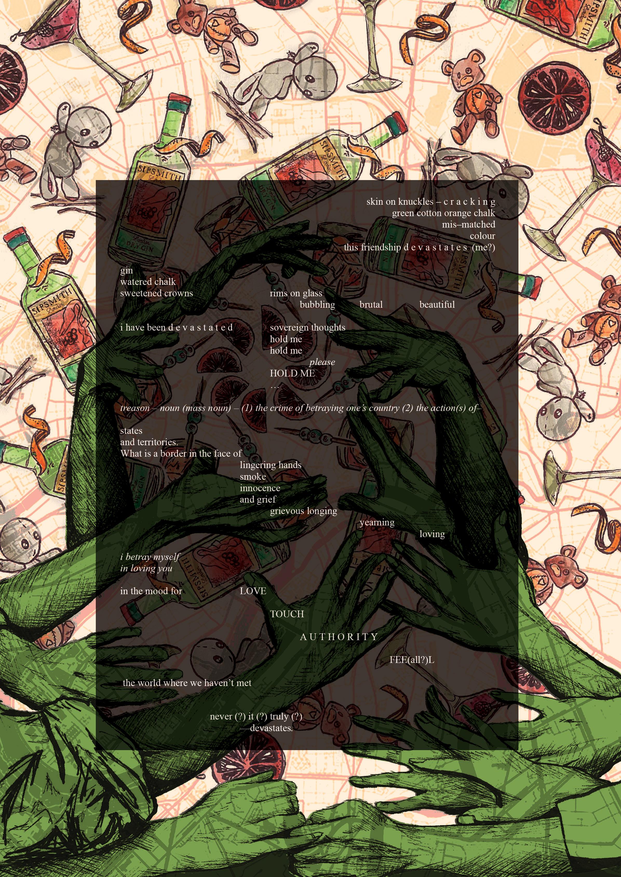 Your jumper stinking sweet in the back corner of my wardrobe. Your warped sense of humour tattooed in the margins of my textbooks. The pencil indentations under my fingers, you scratch scratch scratched inside me.