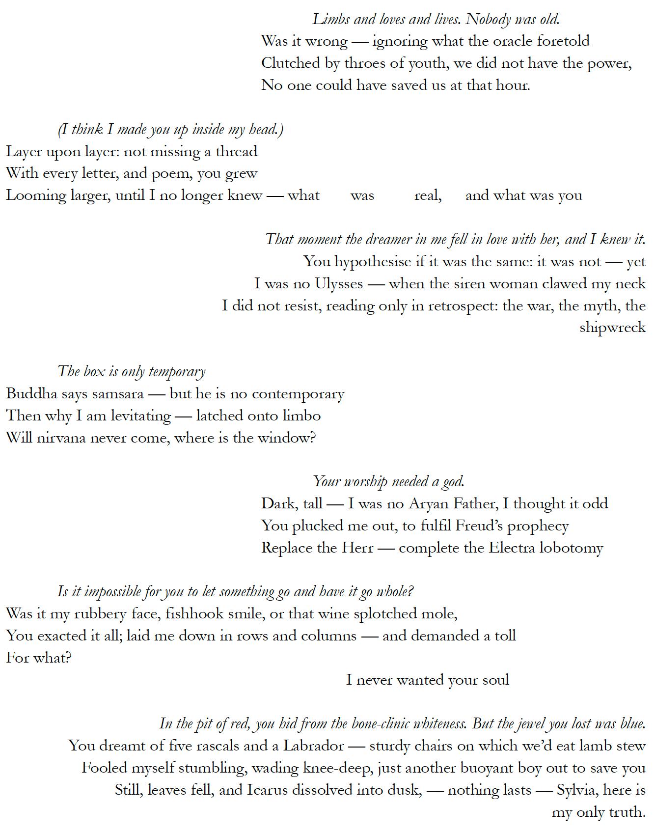 I think of desire like a barb flashing in my belly, sunk like a root. But I don’t want to think of my body as something real or needful, so I think of sleep, a hard-eyed woman rowing me warily downstream. But you know, I haven’t forgotten what we were like when the summer was green and alive and you were the warm pith of November, the soft-limbed song of crickets. I think this is another of those things I forgot to tell you, or chose not to tell you. These night-lit hours are the hours I keep time, when, finally, all that is unsayable articulates itself in remembrance, when memory outruns the body.