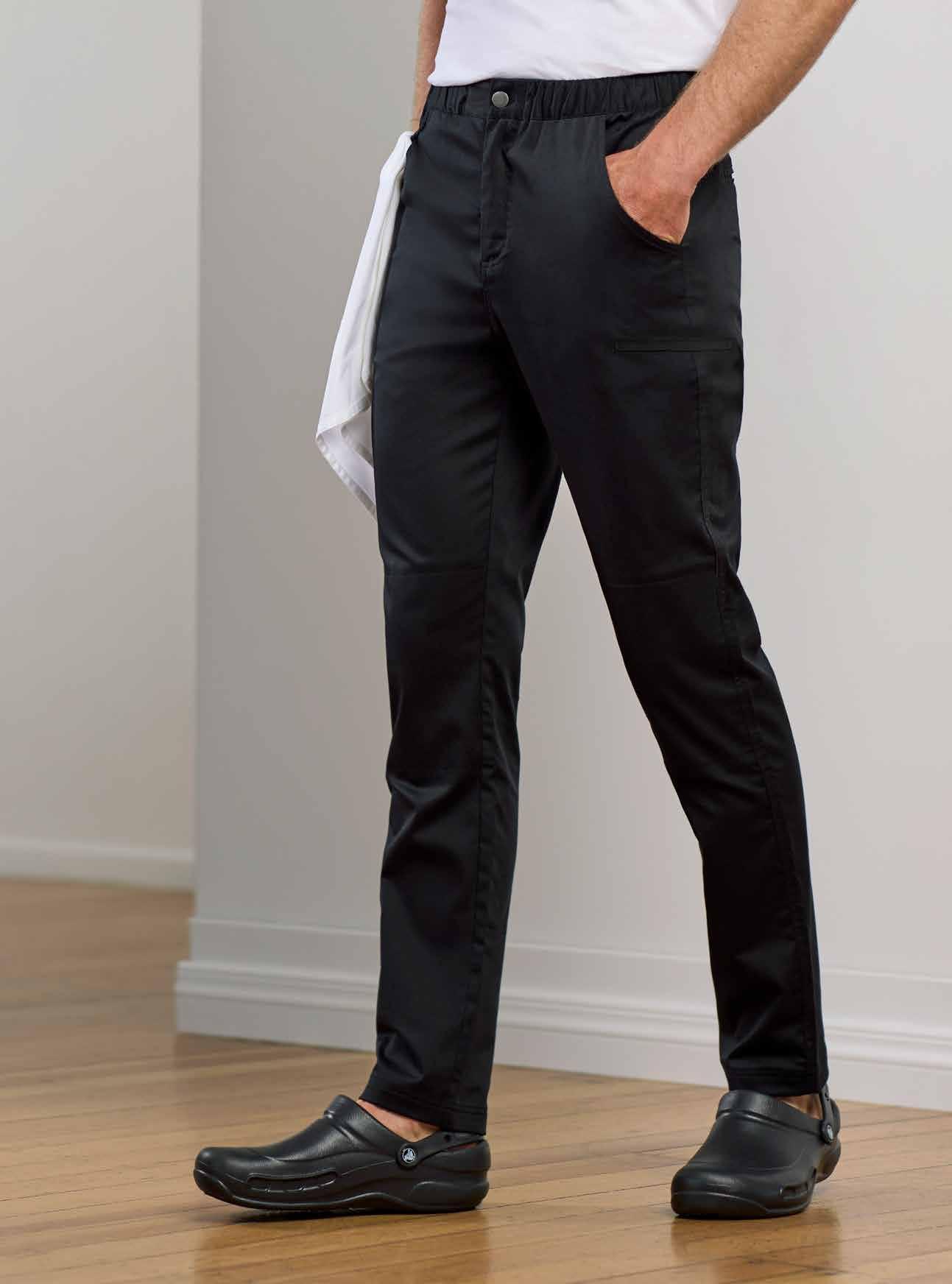 A modern pull-on elastic waist jogger in a lightweight stretch fabric, these pants bring both functionality and on trend styling to the kitchen. Keeping you looking and feeling cool.