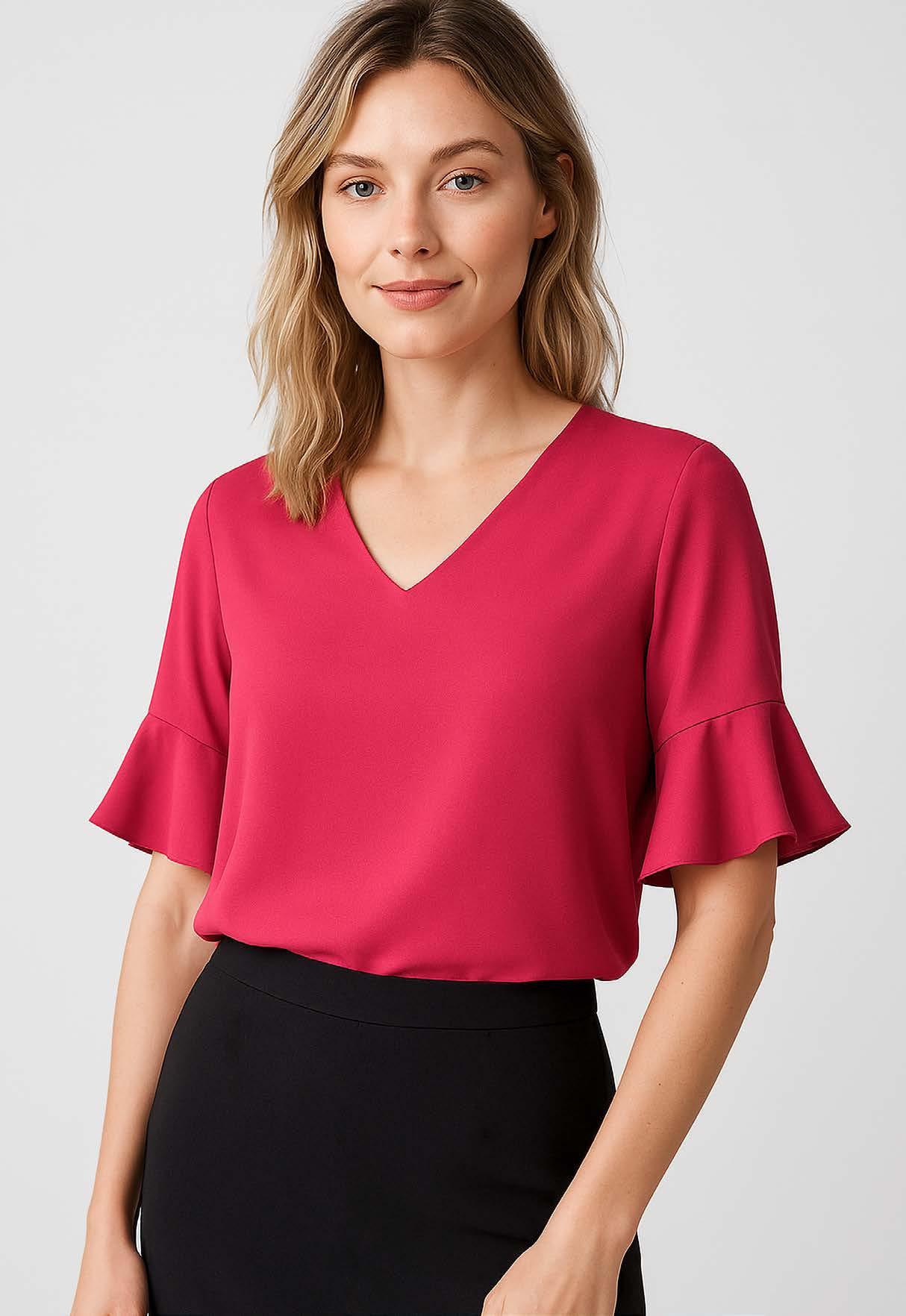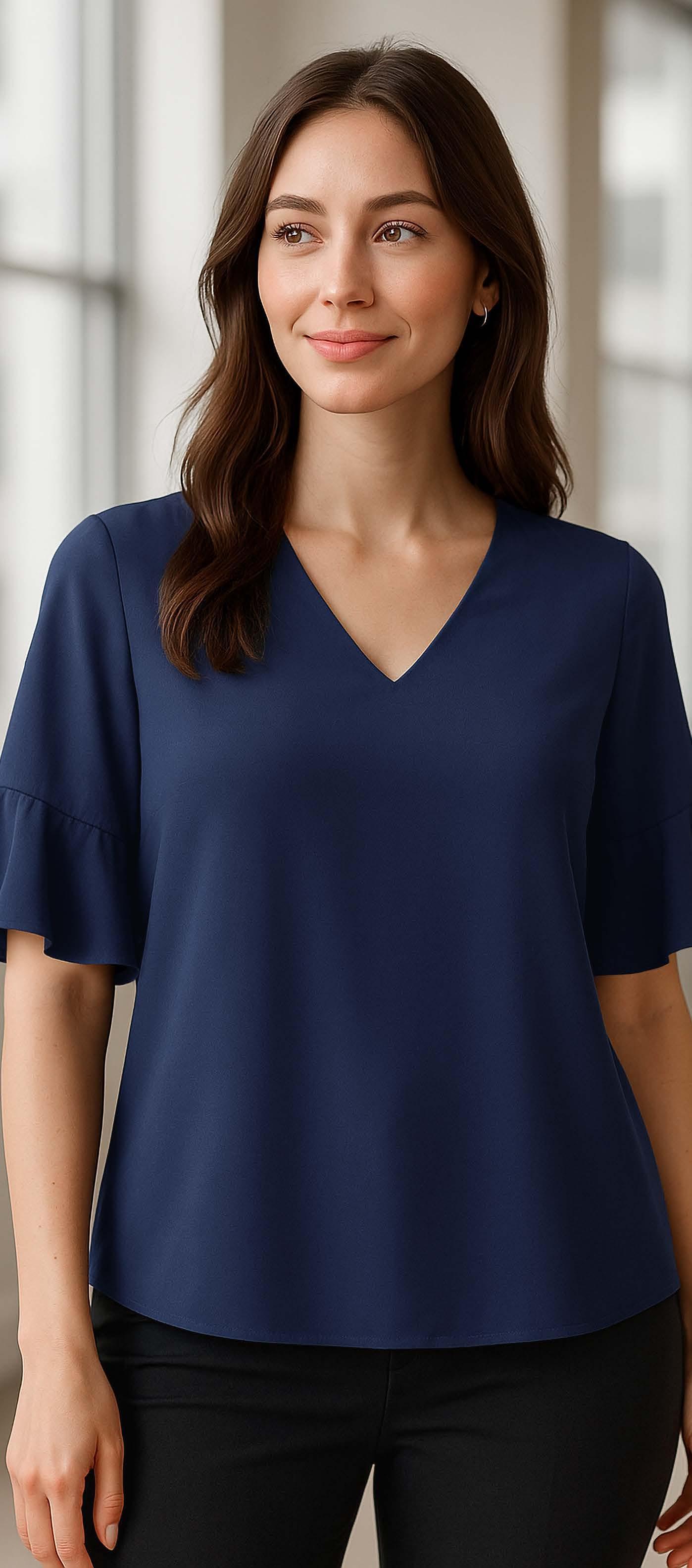 Easy slip-on style top with soft fluted sleeves. Straight hem cut, wear tucked in or out.