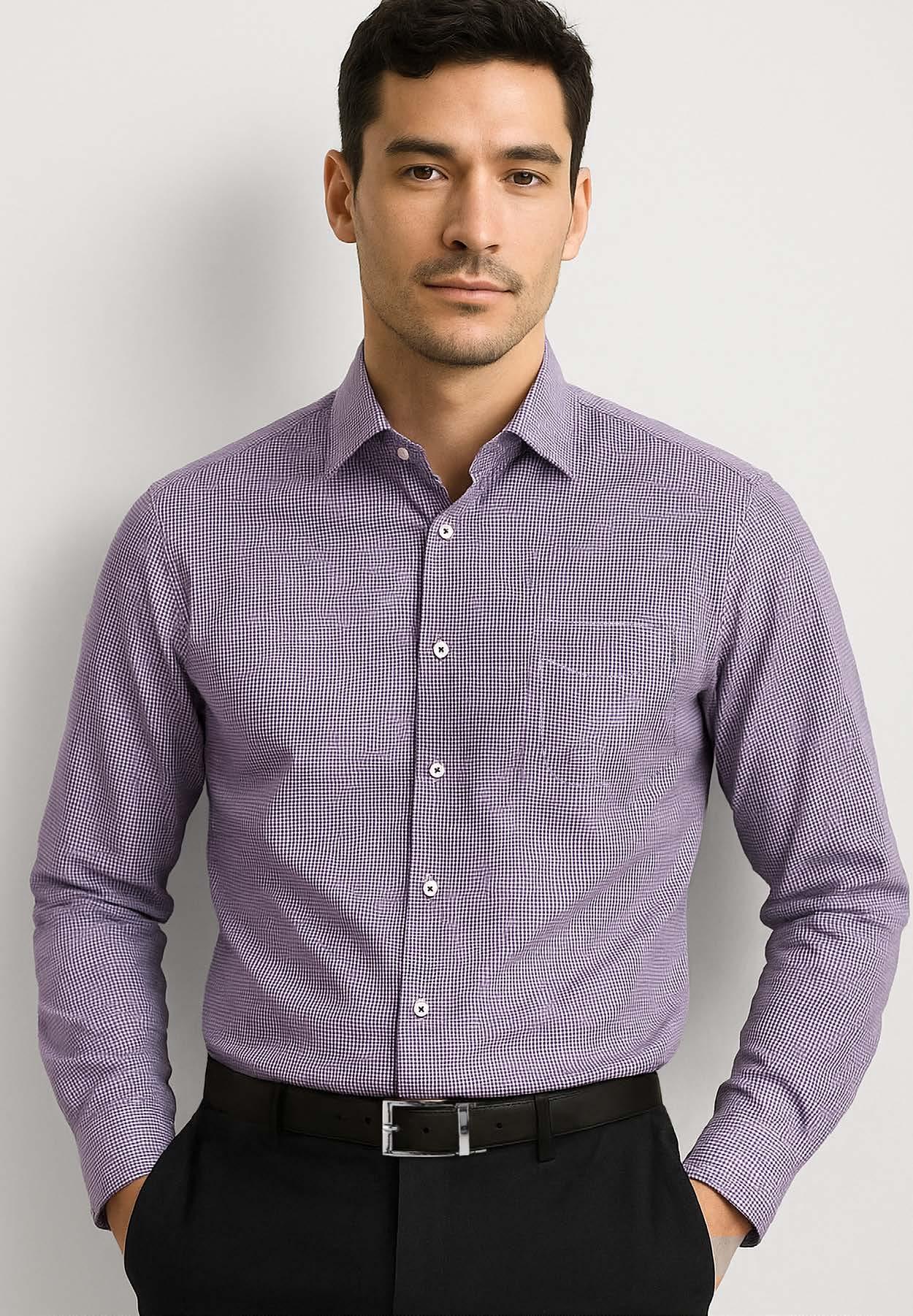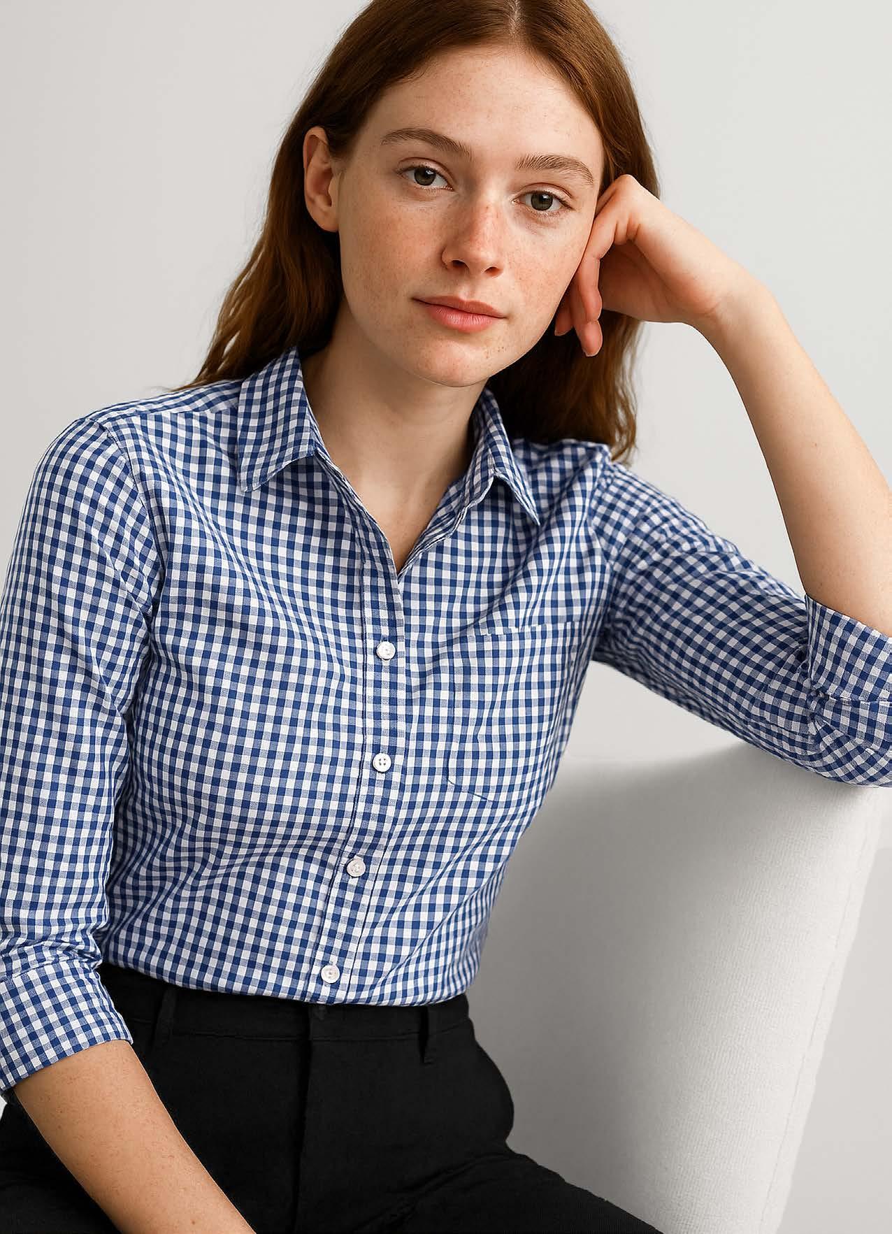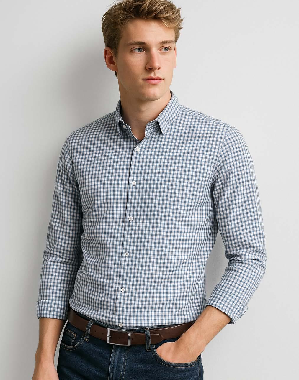 100% Cotton in a yarn-dyed layered check design that sets it apart from the classic plaid.