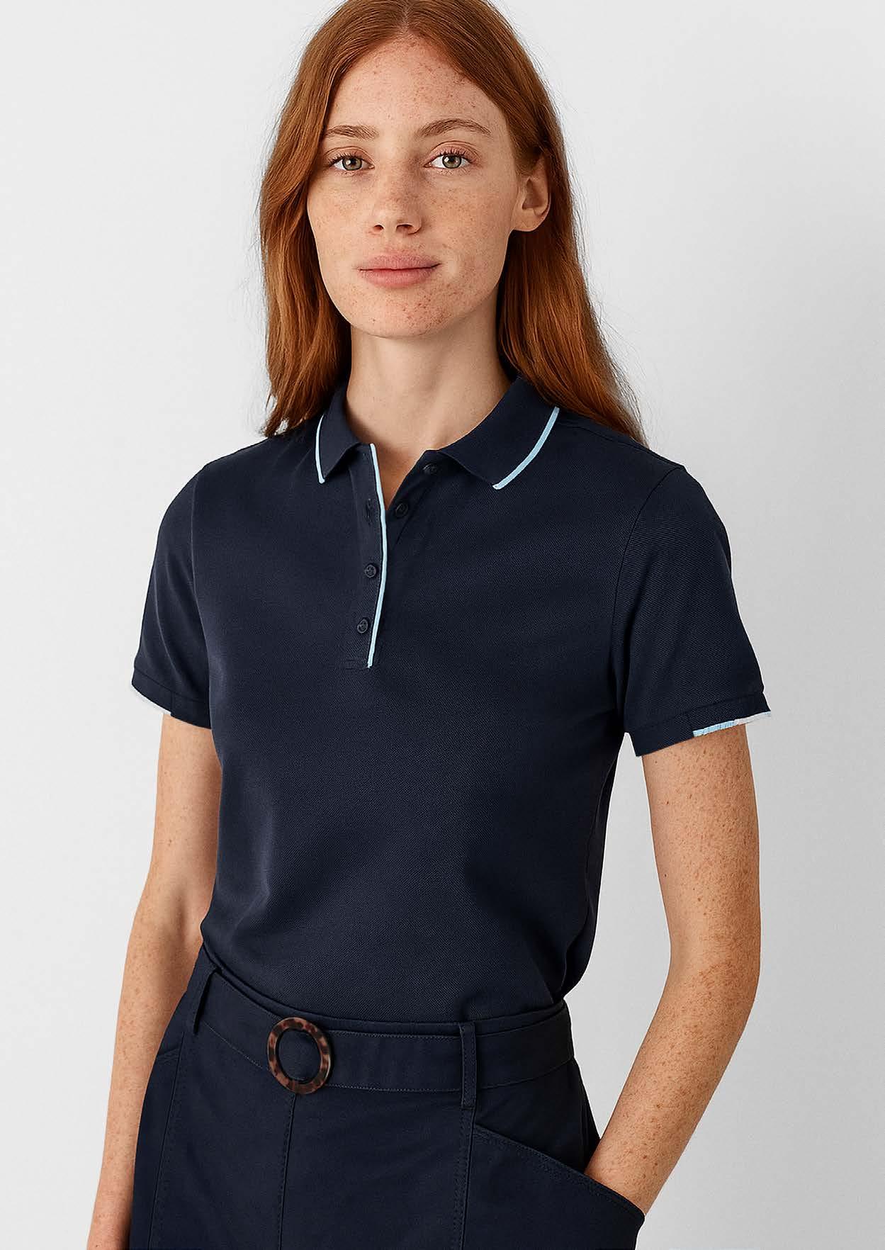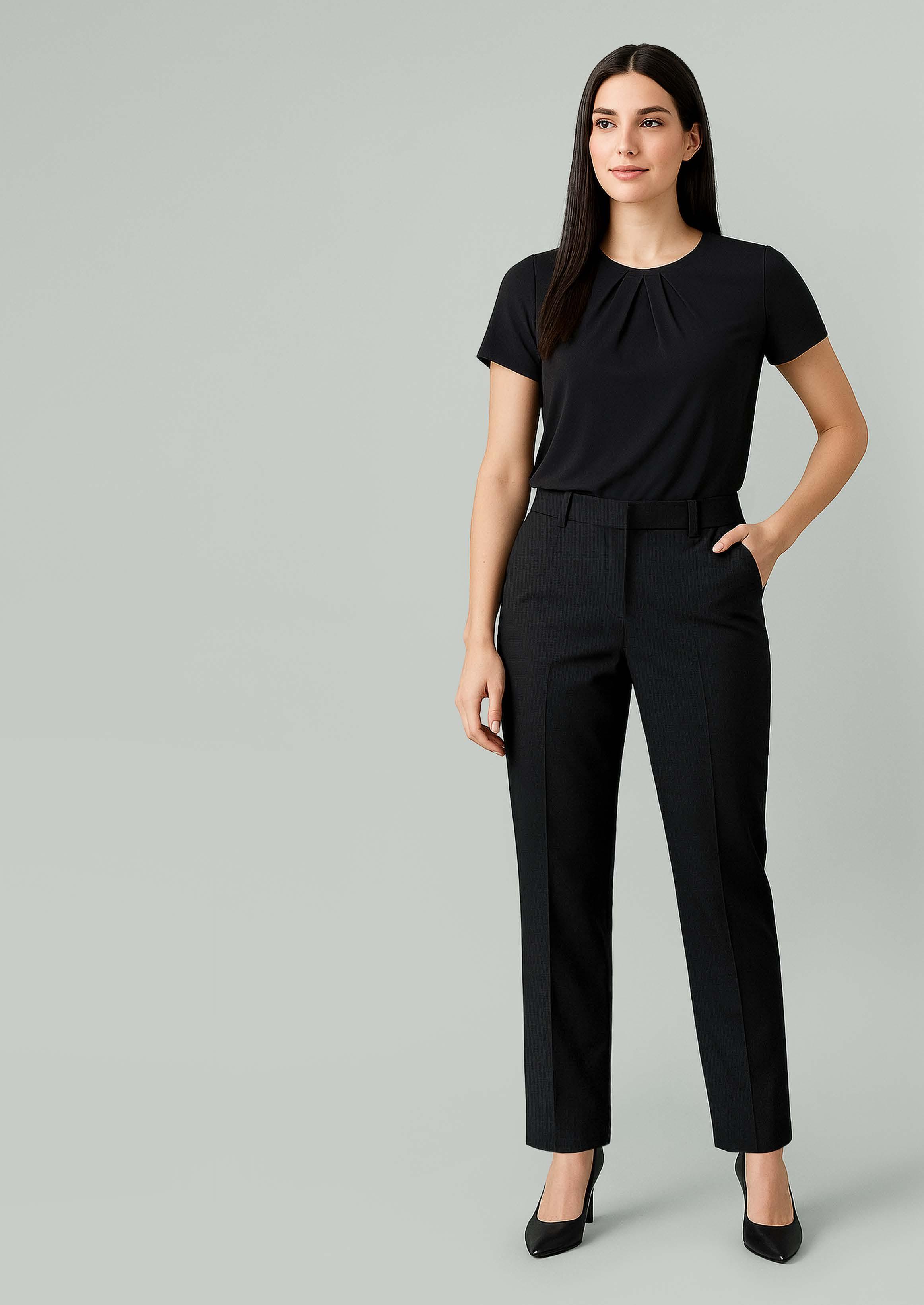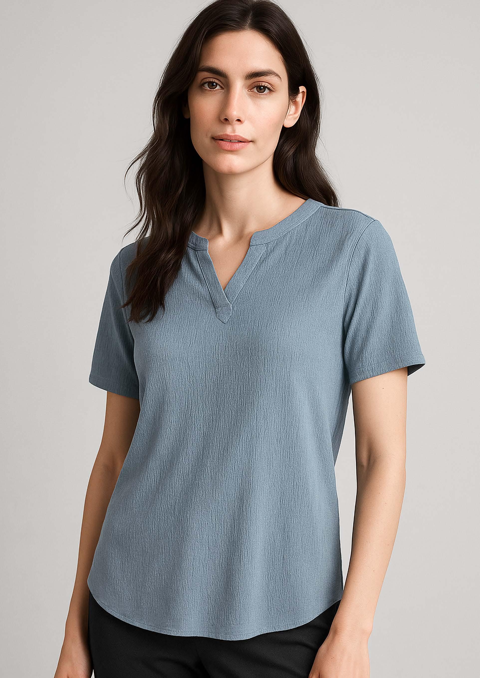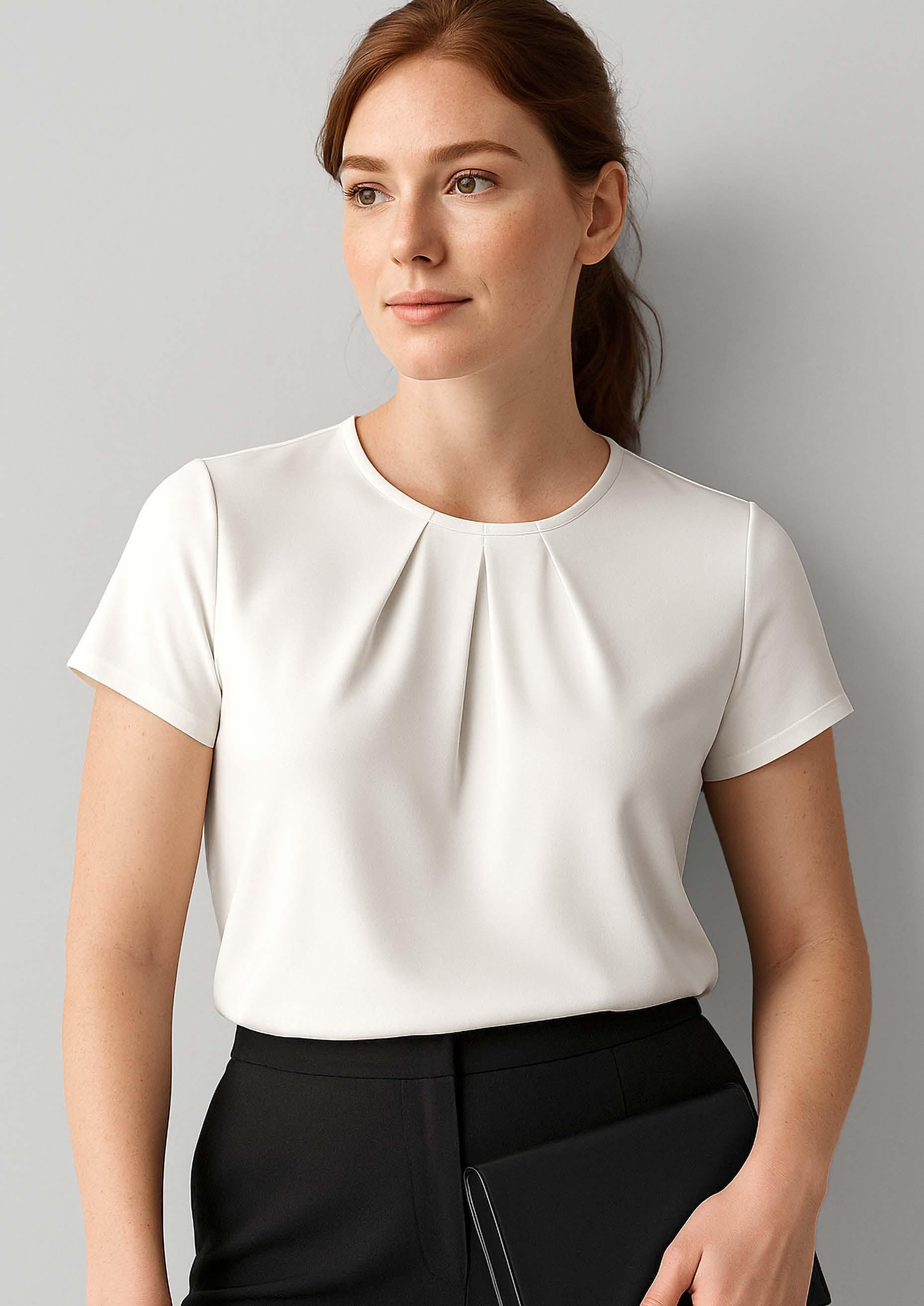 This short-sleeved style has a classic crew neckline with pleat details, it’s designed to be a semi-fitted top. Wear yours tucked in or out.