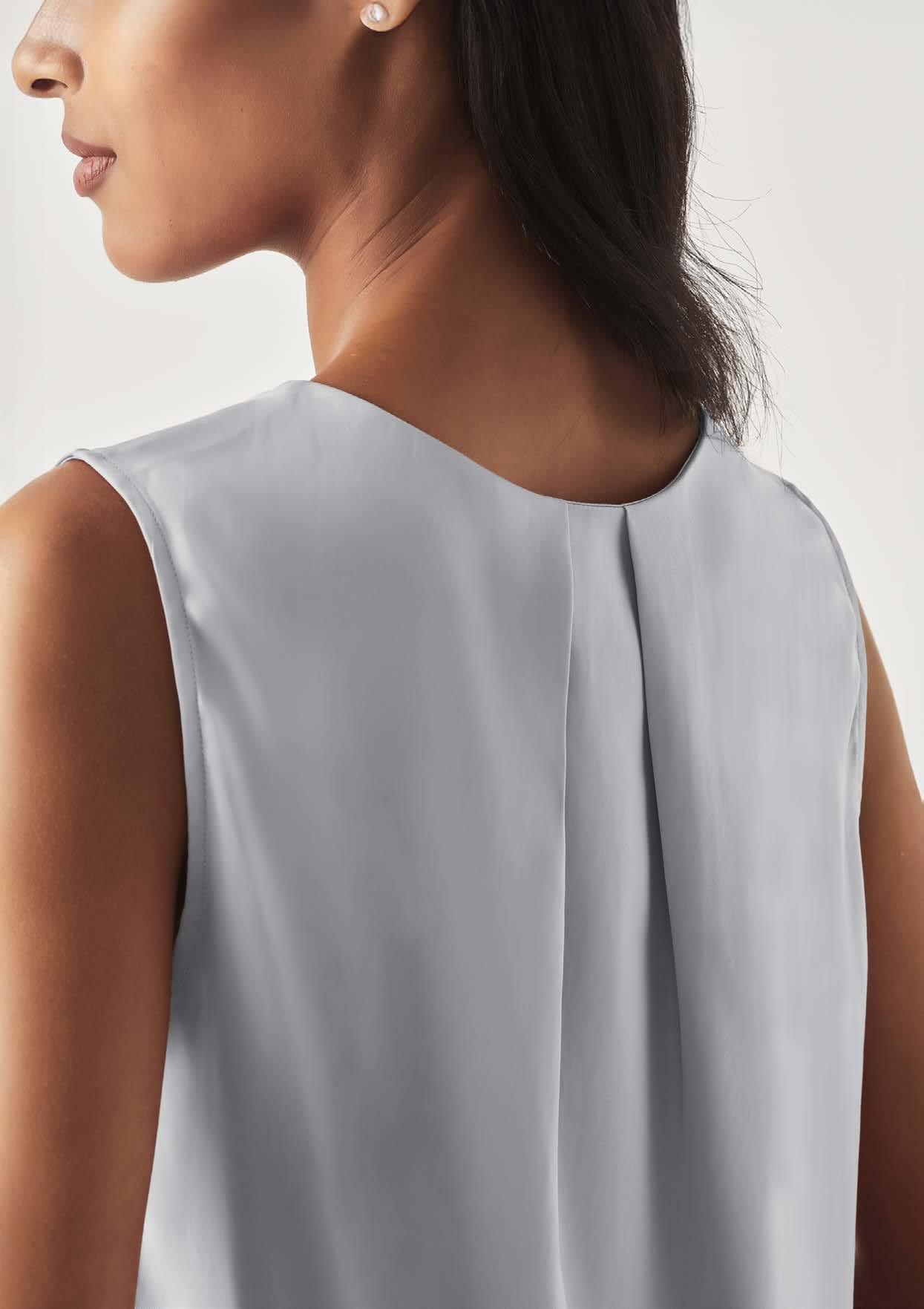 Front and back pleat detailing with longer curved front and back hem. Perfect worn out with slim leg pants or tucked into skirts and straight leg pants.