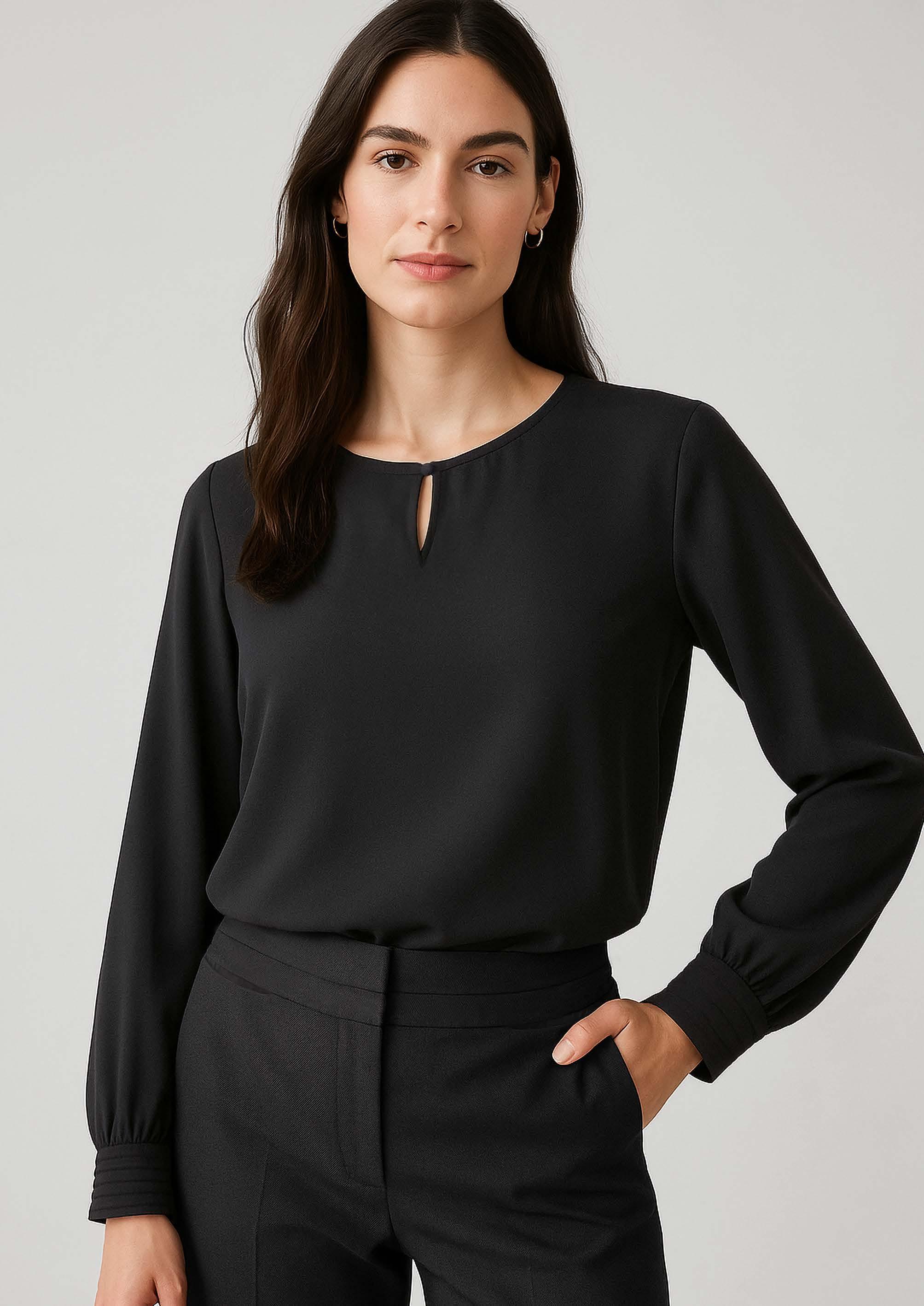 Made from textured stretch knit fabric, featuring soft voluminous sleeves, this piece will elevate your everyday look. Can be styled tucked in or untucked with trousers or your favourite skirt for a professional outfit.