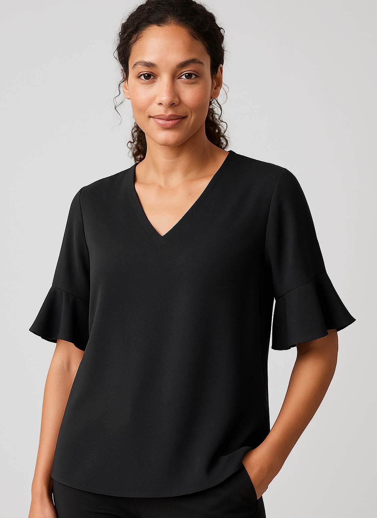 Easy slip-on style top with soft fluted sleeves. Straight hem cut, wear tucked in or out.
