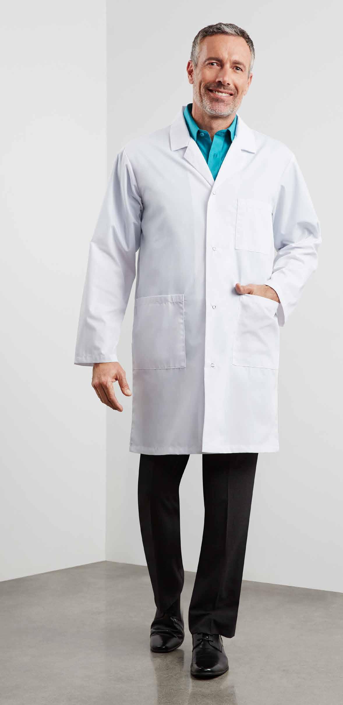 FEATURES Longer 3/4 length with notched collar and back hem vent • Chest pocket with pen line and 2 front pockets at hip