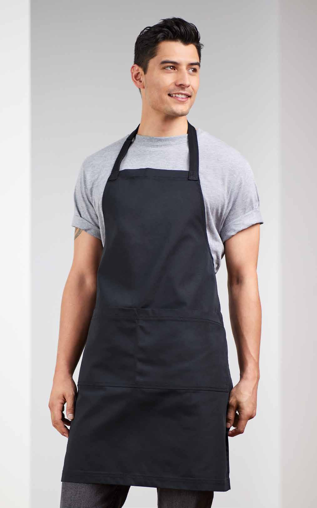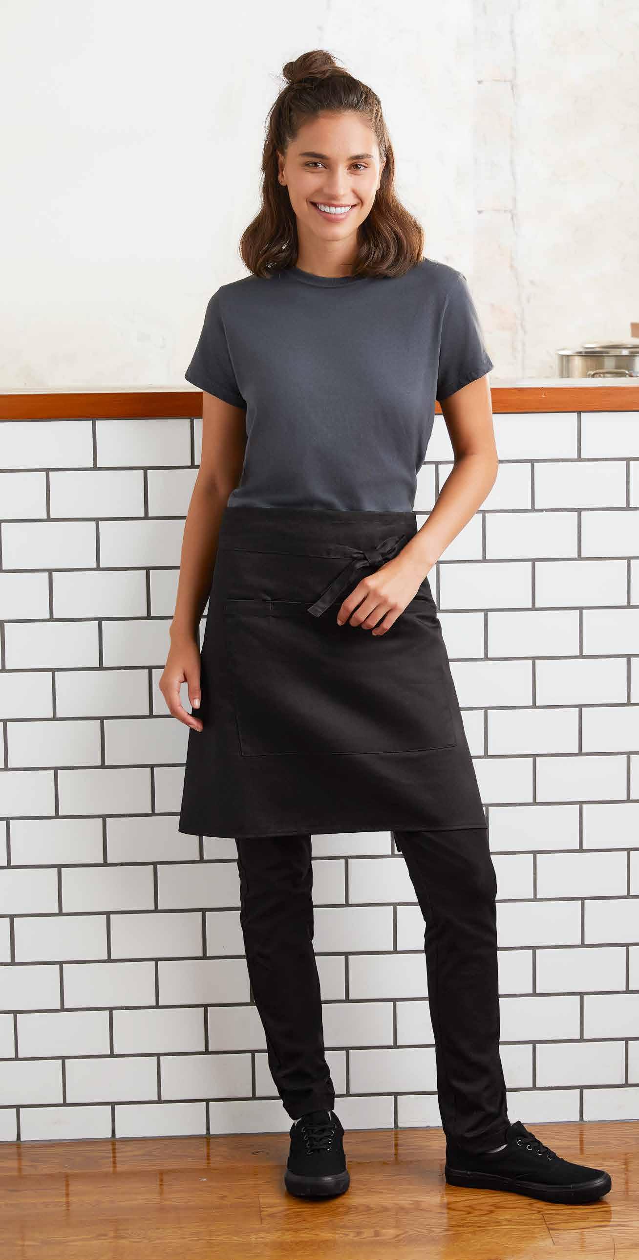 An essential black waist apron is a must have in any food service industry. Made from reliable, colourfast poly cotton twill and featuring large front pocket and a handy loop.