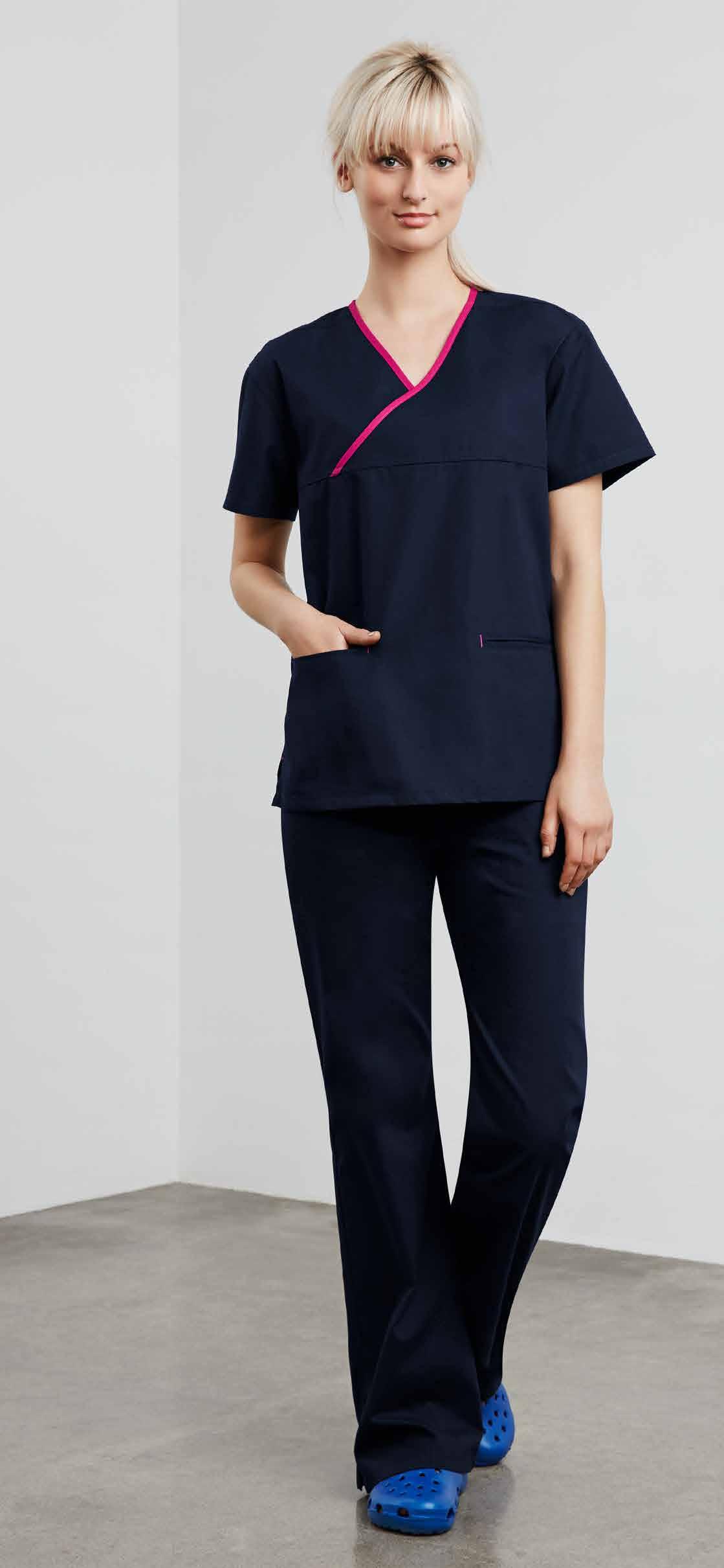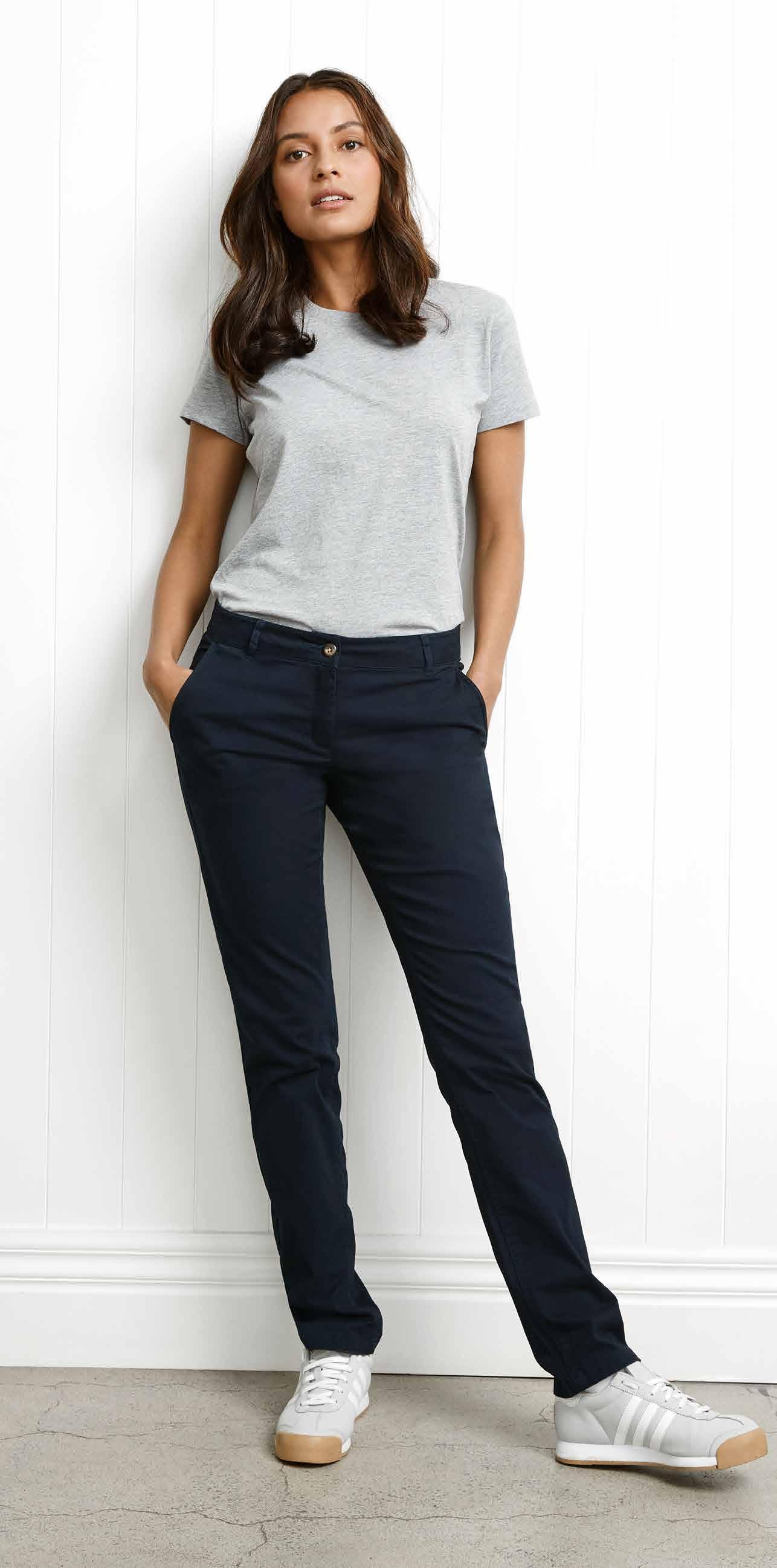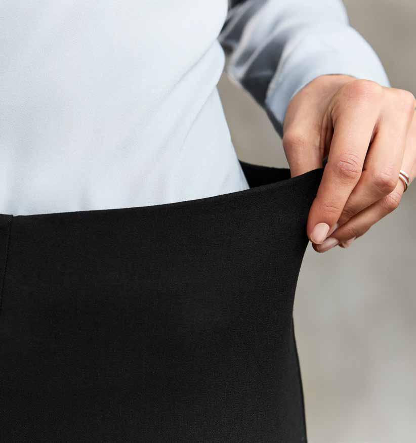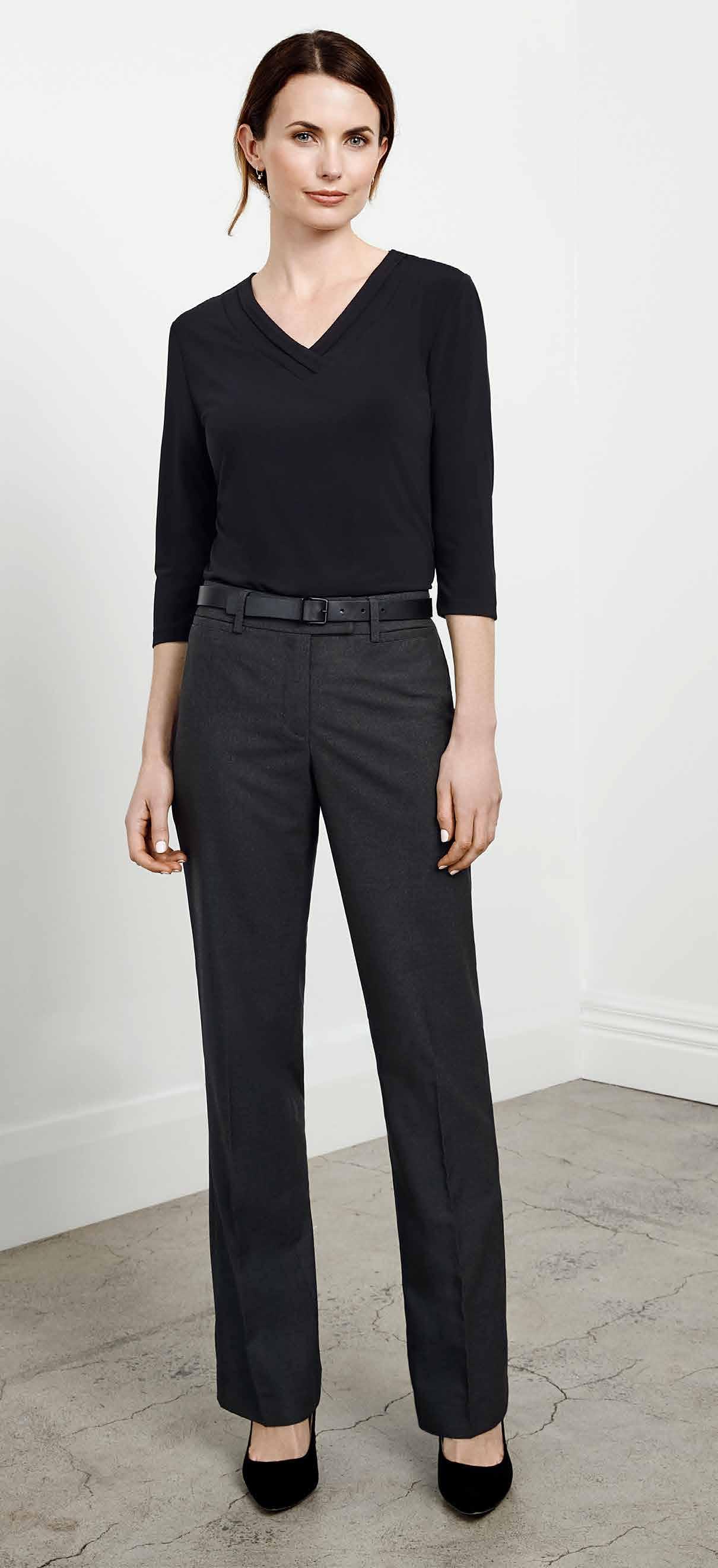 PANT FEATURES Womens fit with flat front styling • Stitch detail around pockets • 2 Front welt pockets with functional inner right pocket • Flat front with elasticated rear waistband