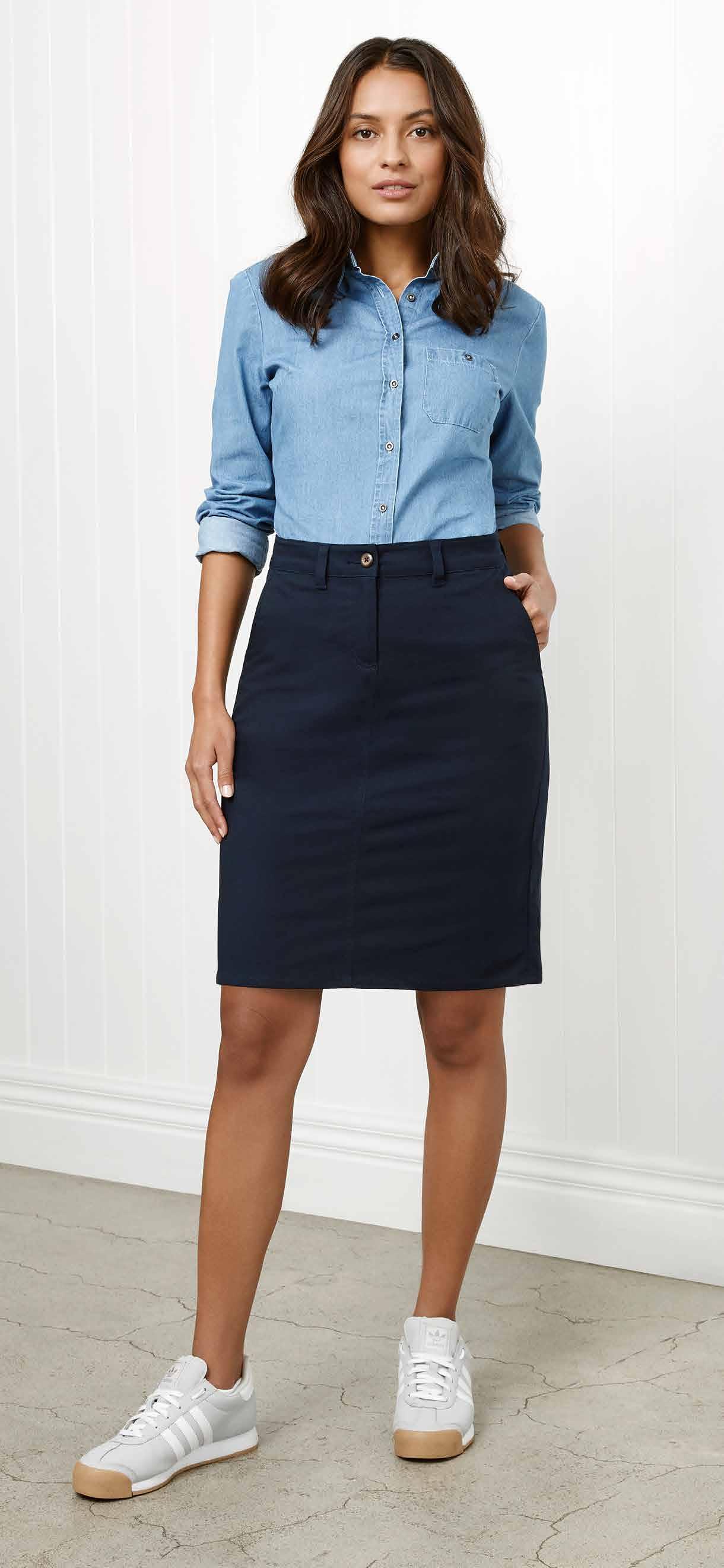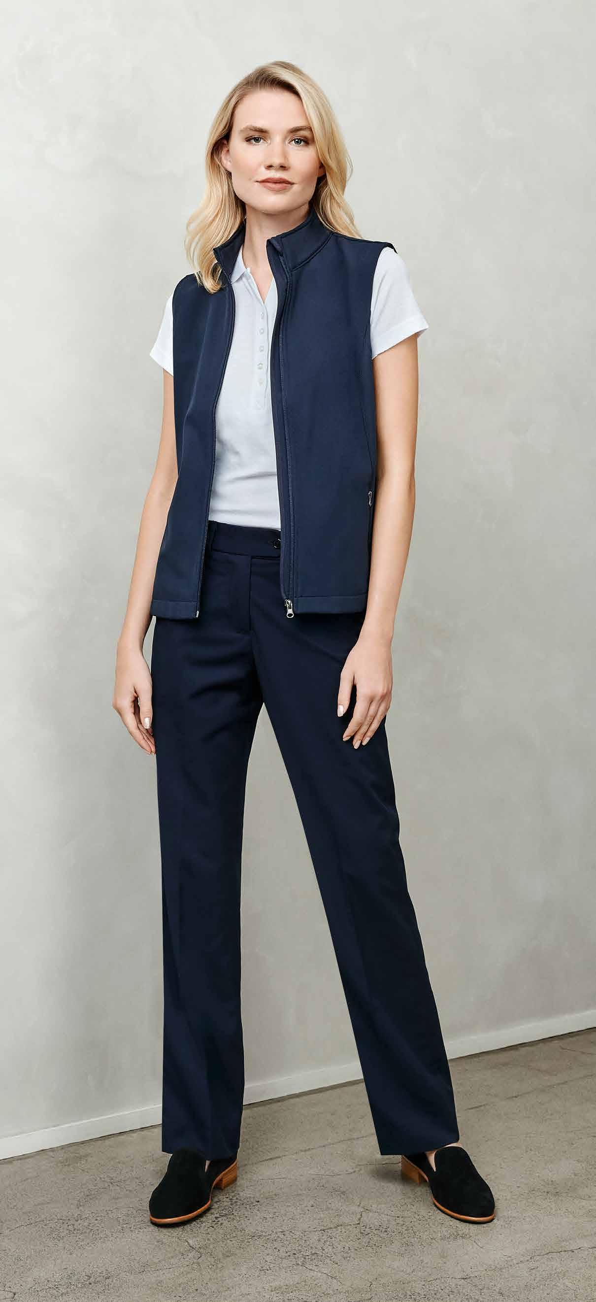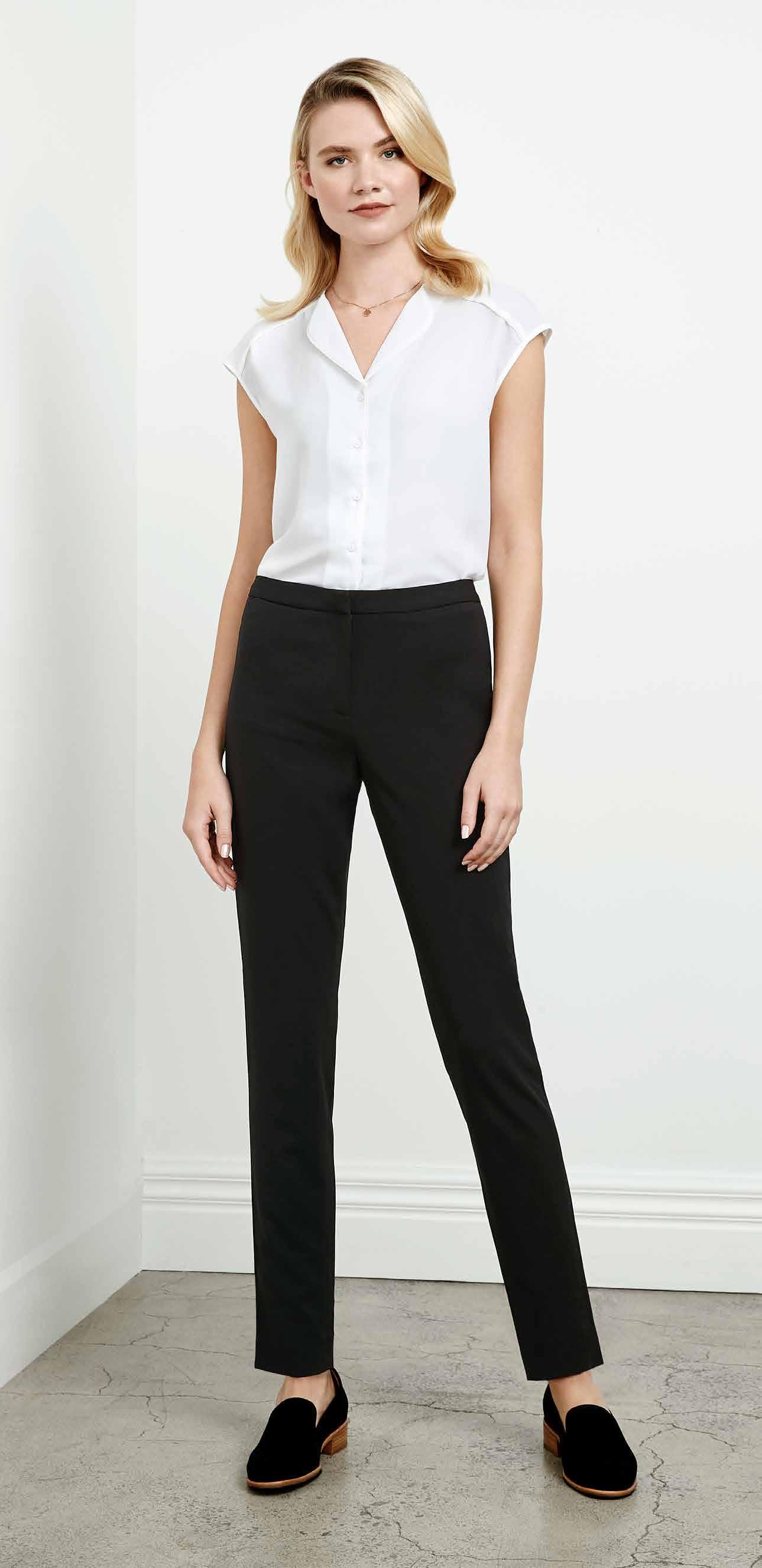 PANT FEATURES Womens fit with flat front styling • Stitch detail around pockets • 2 Front welt pockets with functional inner right pocket • Flat front with elasticated rear waistband