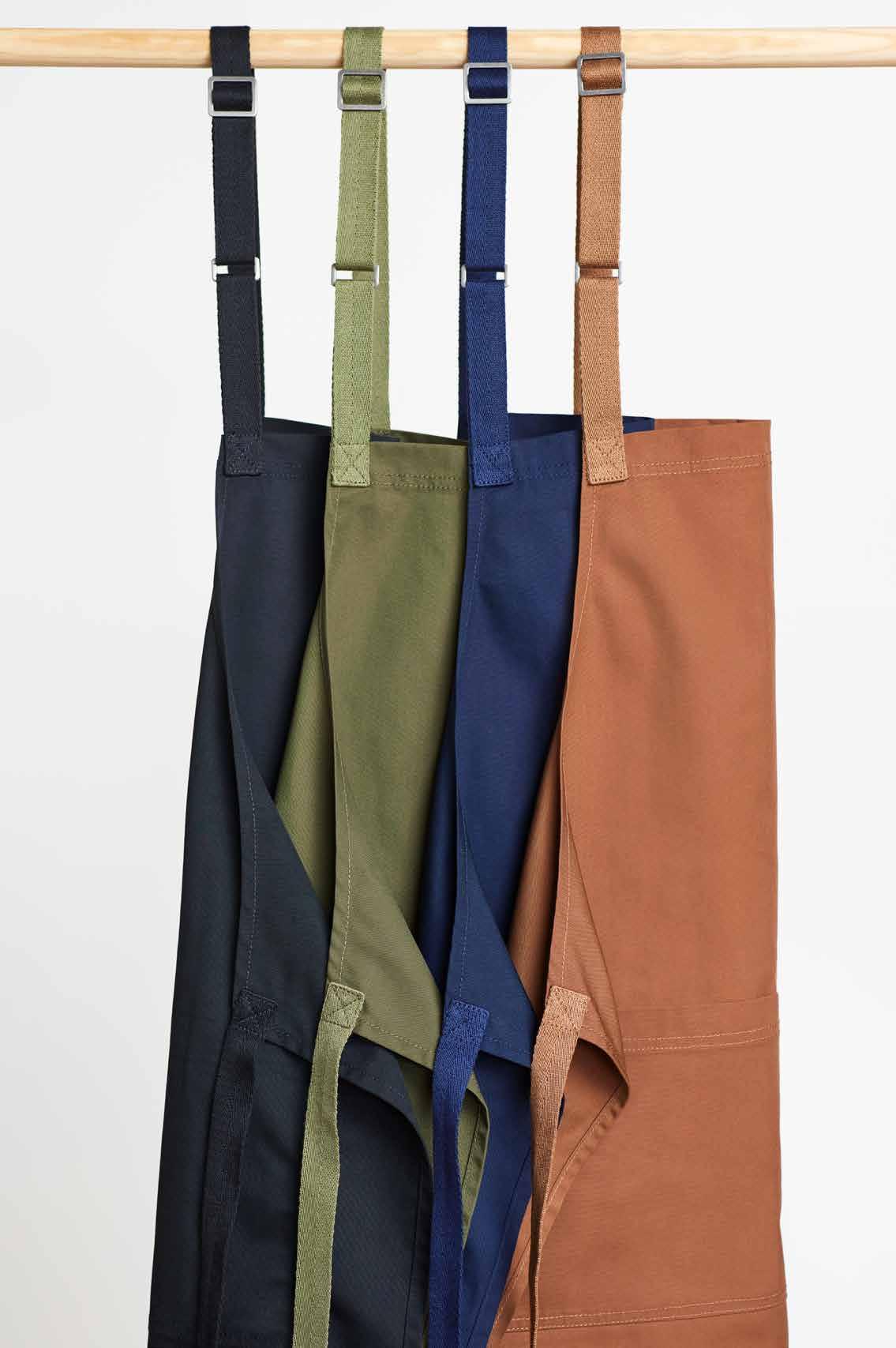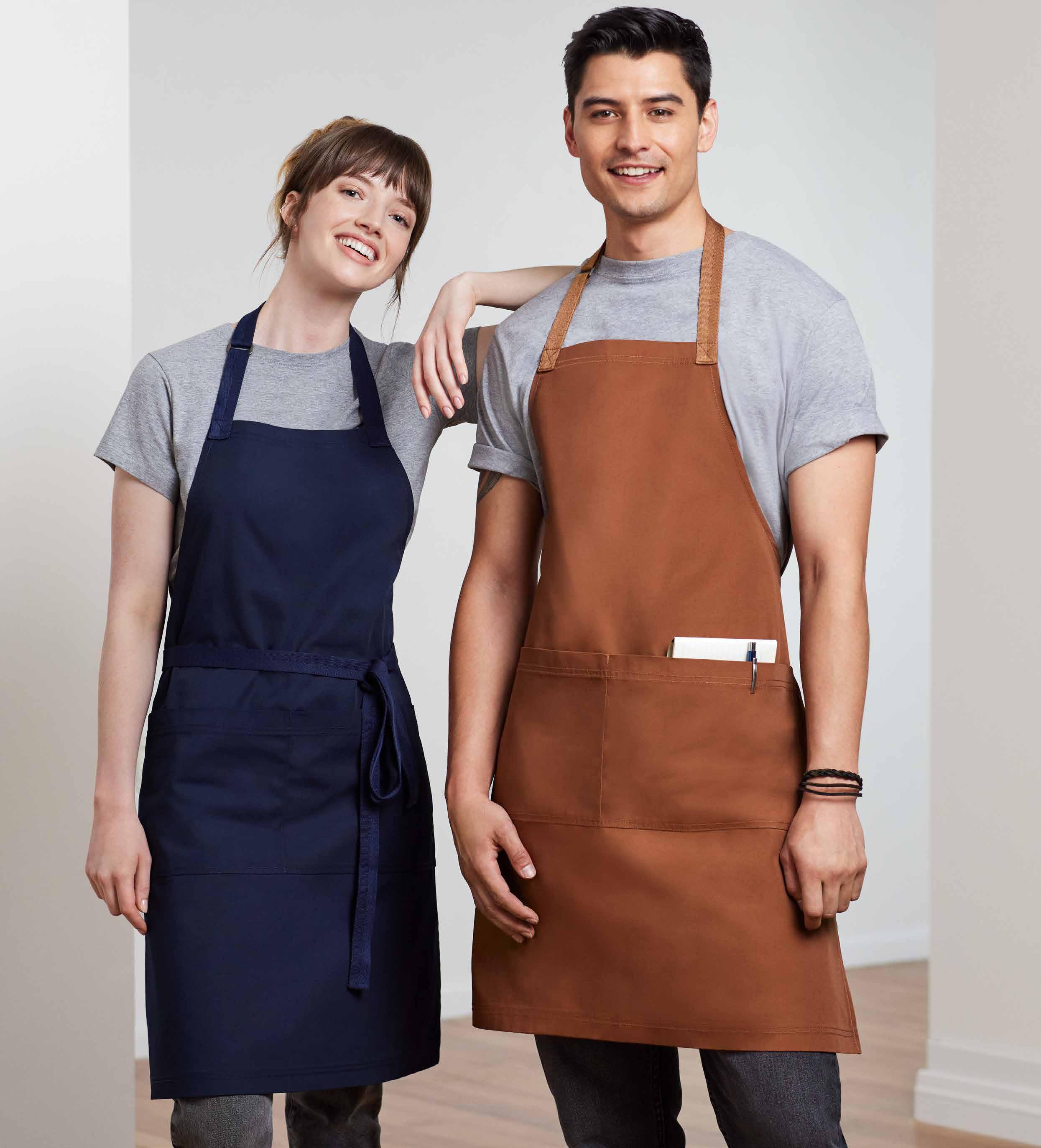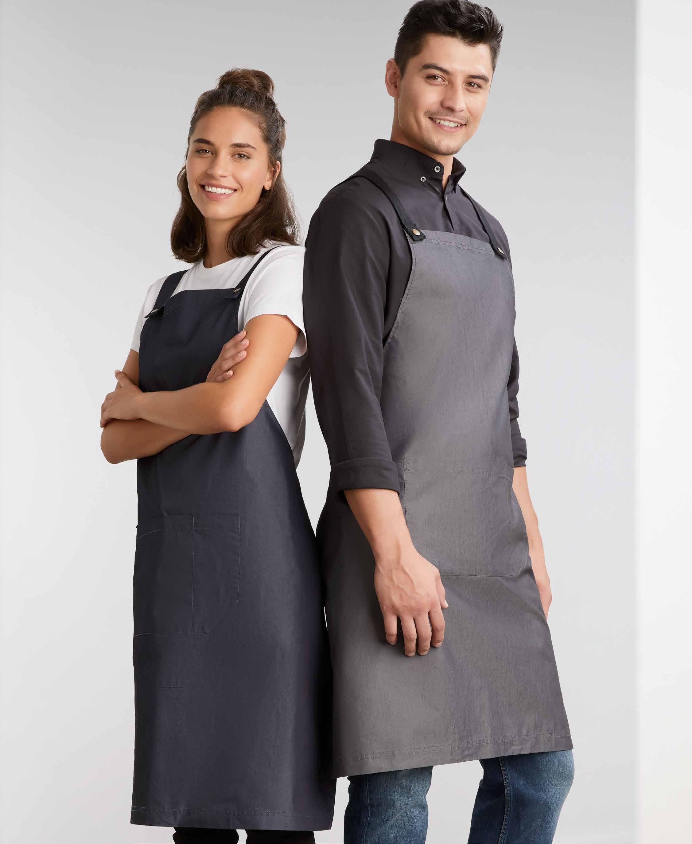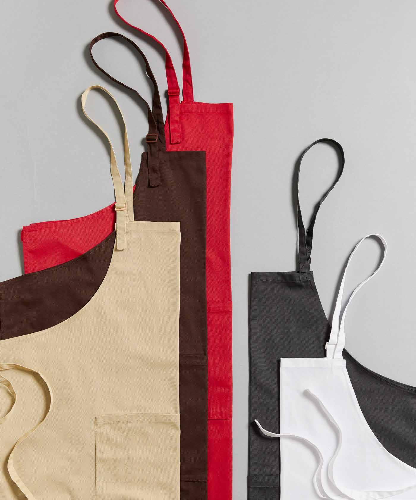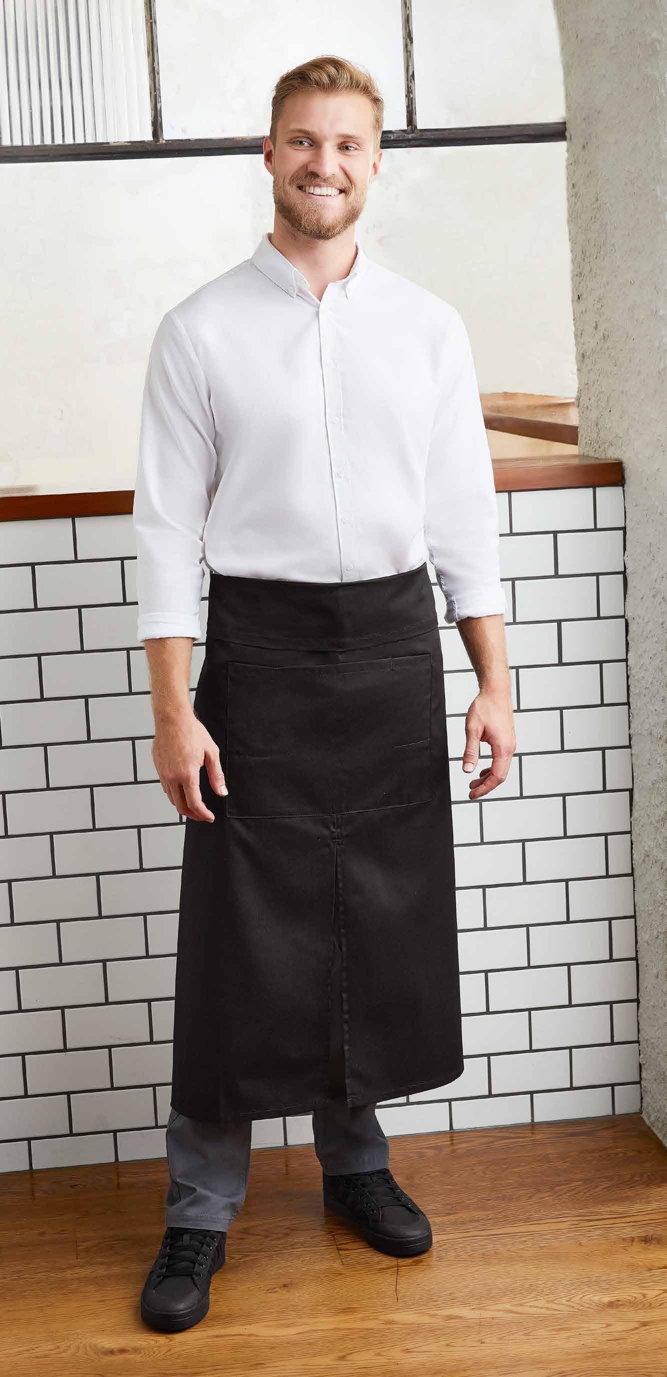 FEATURES Short waisted, above the knee length • Unique styling • Towel loop at back of apron • 1 Large central front pocket with special side slide pen and bottle opener provision • Free size 86cm x 50cm