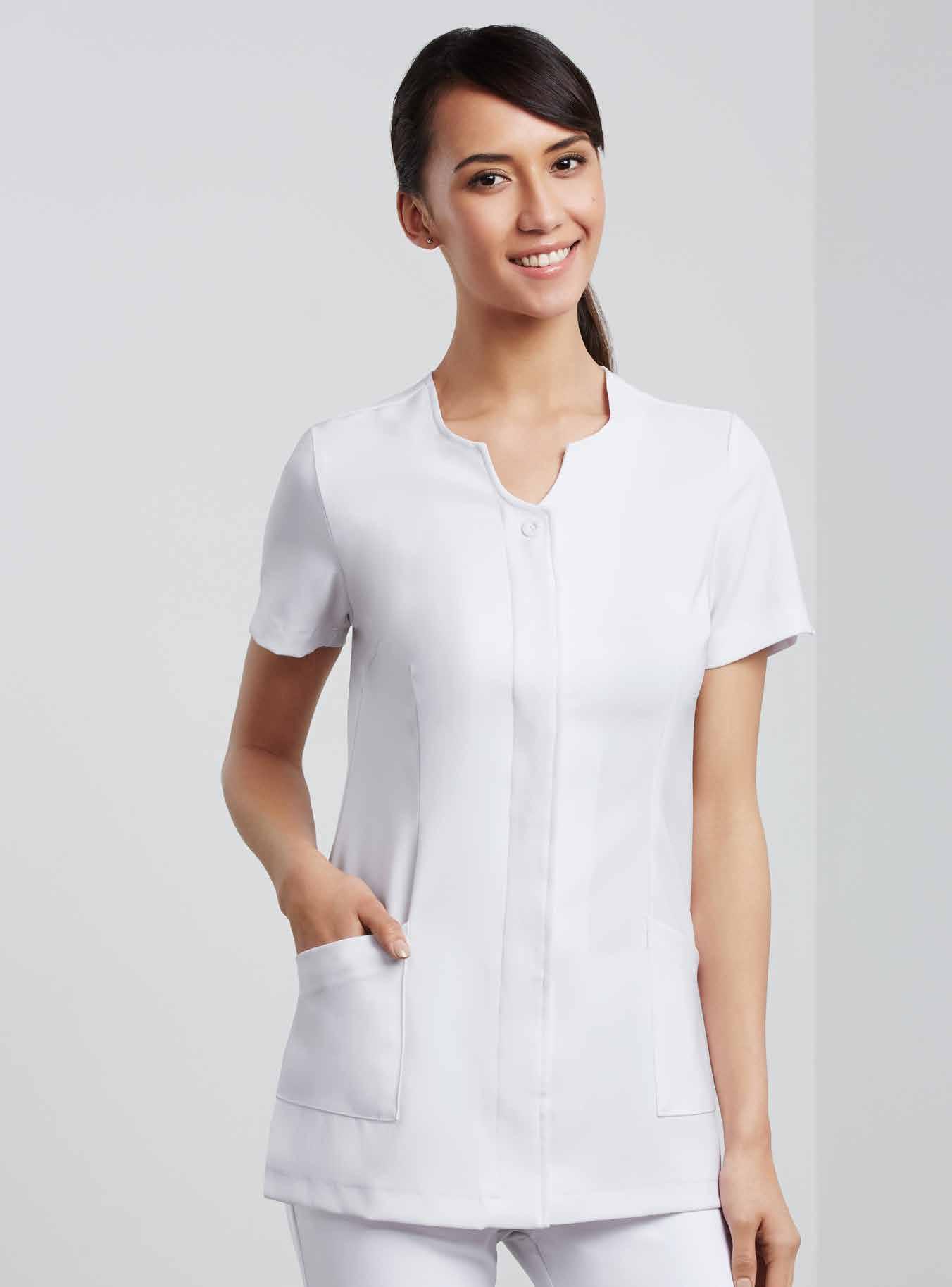 Our Bliss Tunic adds a subtle touch of glamour with a diamanté zip feature. Practical front opening style, with elegant collar and longer sleeve raises your uniform to luxury level.