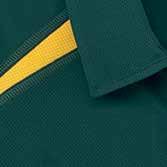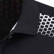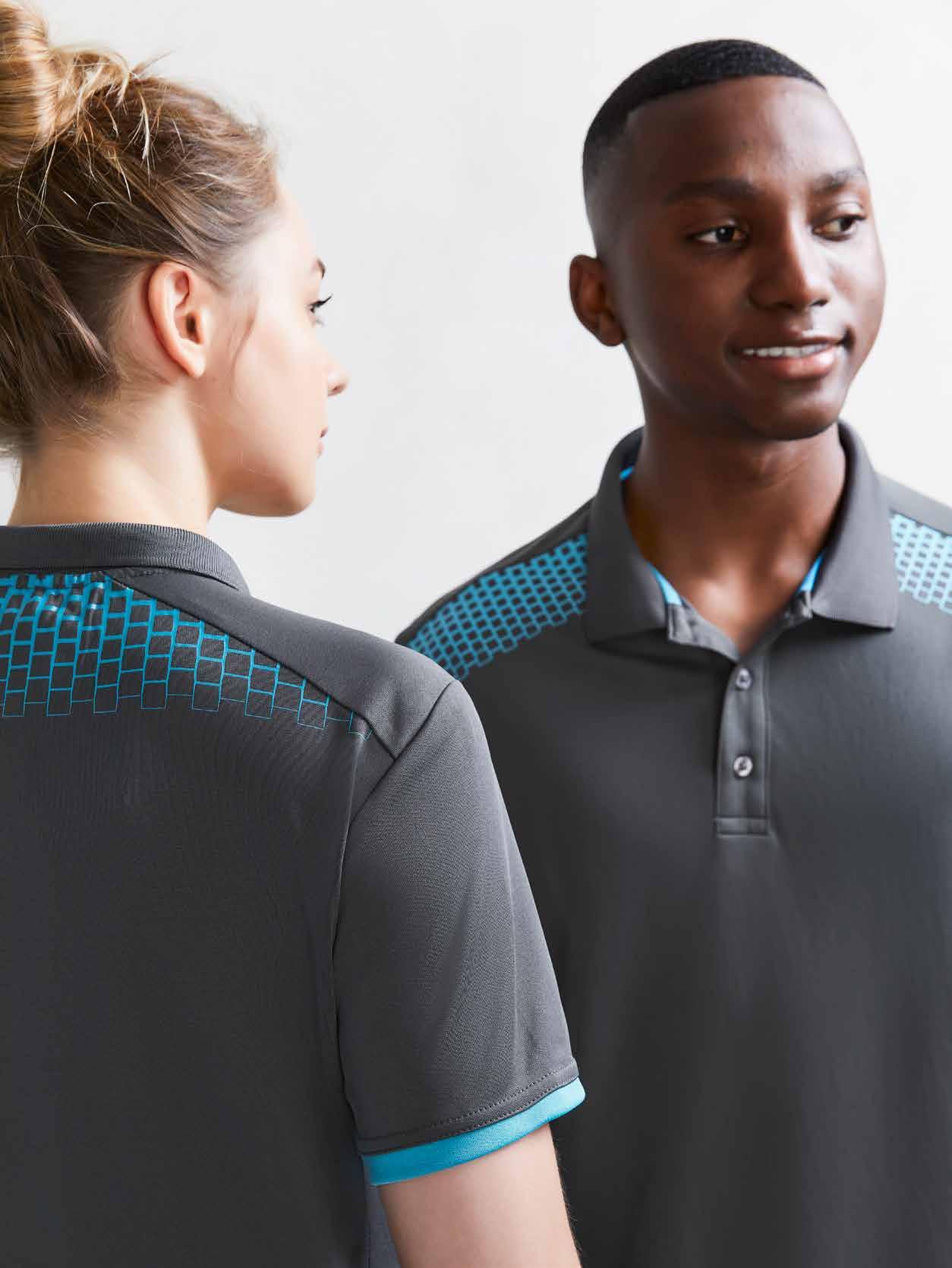 FEATURES Honeycomb weave with stretch elastane • Flat knitted collar with contrast button placket • Side panels with dynamic contrast piping • Unique print features on torso, sleeve and back neck to accent your logo • Longer length for added coverage when moving • Mens style includes loose pocket