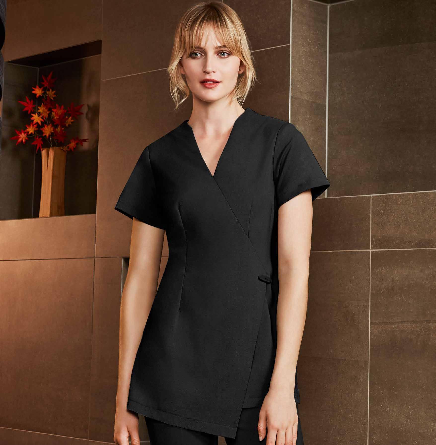 A classic button-through crossover design for the stylish beauty professional. Traditonal Mandarin collar, simple lines and no pockets for a clean crisp look.