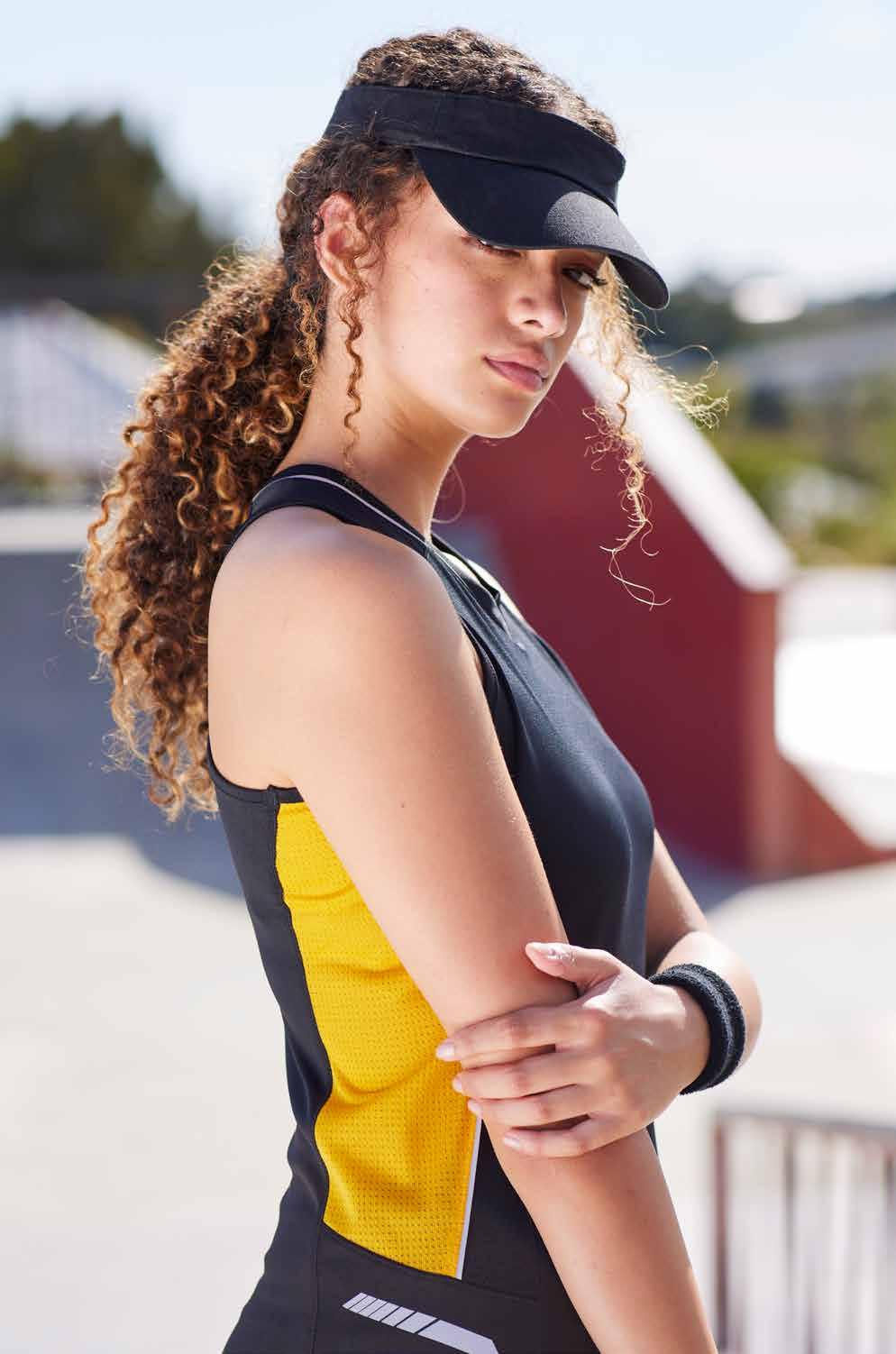• Contrast print design on shoulder and back • Patterned mesh side panels for added ventilation
