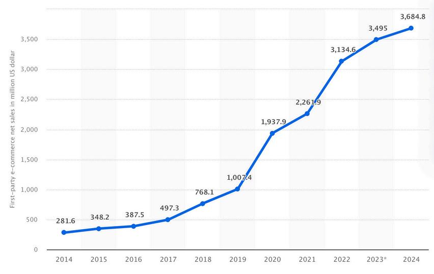 In 2023, Lululemon made $3.5b through e-commerce sales which makes up just over half of their total revenue for that year This shows a good balance between their online presence and their brick and morter stores making close to equal sales