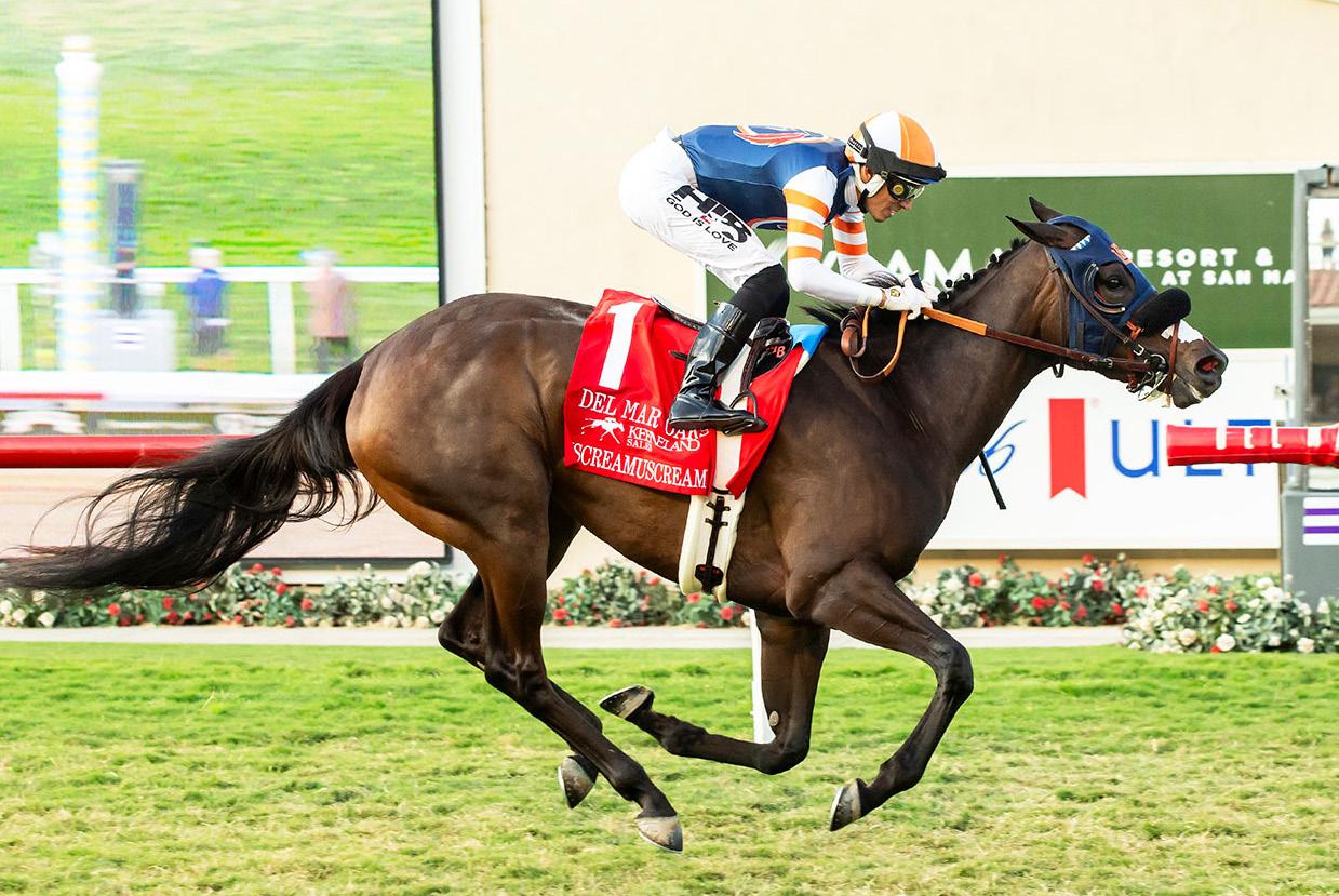 Race Record: At 2, unplaced in 1 start; at 3, two wins (Lady of Shamrock S. [L], SA, $60,000) in 3 starts; at 4, four wins (Exacta Systems Ladies Turf Sprint S. [G2], KD, $878,940-ncr, Monrovia S. [G3], SA, $60,000, Osunitas S. [LR], DMR, $60,000, Wishing Well S.-R, SA, $60,000), twice 3rd (Breeders’ Cup Turf Sprint [G1], DMR, $90,000, Matriarch S. [G1], DMR, $36,000) in 8 starts; at 5, 2025, two wins (Jaipur S. [G1], SAR, $275,000, Never Say Die Ladies Turf Sprint S. [G2], KD, $1,154,900) in 3 starts. Totals: 8 wins, twice 3rd in 15 starts, earned $2,771,228. Breeders’ Cup nominated. KTDF.