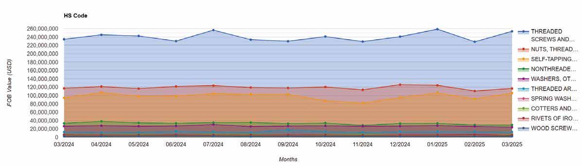 • 越南:越南既是製造基地,也是轉運點,2024 年進口中國扣件的金額達到 5.187 億美元,反映出其在區域供應鏈中的戰略地位。