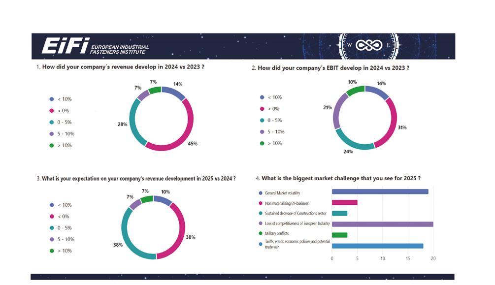 EIFI 總經理 Hans Führlbeck 總結各市場小組和運作 委員會成功完成的工作,並重點分享了過去 12 個月的主 要工作目標,像是每月(基於半數歐洲扣件生產所用已抽 和未抽線線材)所公佈的 EIFI 線材成本變化指數、CBAM 活動、與 FRED 達成讓所有協會會員都能使用碳足跡計 算工具的協議以及 3 月 25 日在司徒加特扣件展舉辦的 PFAS 活動邀請同是活動贊助商的化學品製造商 ( 包括 Dörken Coatings、MKS Atotech、Precote、MacDermid Enthone、Nof Metal Coatings Europe)、塗料商、扣件生 產商及其客戶的講者。此活動登記的出席率非常高(超過 100 人),顯示出對 PFAS 主題的濃厚興趣。