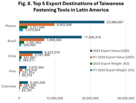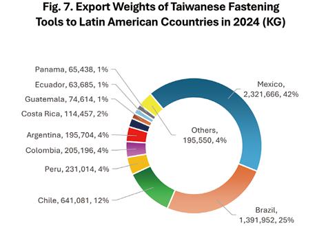 Since Taiwan's fastening tools also rely on exports, this article only analyzes the export aspect here. Table 6 is based on the export weight in 2024, ranking Taiwan's top 10 export destinations in Latin America from the largest to the smallest. The top five were Mexico (with the 2024 export value of USD 23.9 million and the export weight of 2,321.6 tons), Brazil (USD 17.5 million, 1,391.9 tons), Chile (USD 6.5 million, 641.0 tons), Peru (USD 2.0 million, 231.0 tons), and Colombia (USD 2.4 million, 205.1 tons). Taiwan's total market size for fastening tool exports to Latin America in 2024 reached USD 61.7 million by value and 5,500.3 tons by weight. In the first half of 2025, the export value reached USD 26.9 million and the weight reached 2,581.4 tons. Based on this current value, it is estimated that the total export value and weight for the entire 2025 may decrease by 12% and 6% respectively compared to 2024. Figure 7 shows that Taiwan’s export weight to Mexico accounted for 42% of Taiwan's total export weight, 1.6 times that of Brazil (25%), showing a significant gap between Mexico and other listed countries. Mexico was Taiwan's most important fastening tool export destination in Latin America, with Brazil (25%) and Chile (12%) being the second and third largest export destinations respectively.