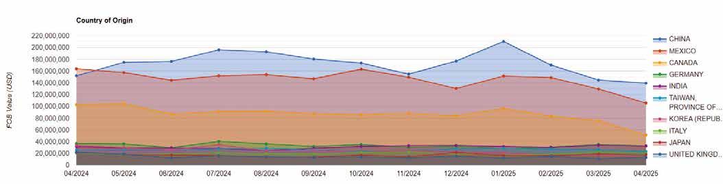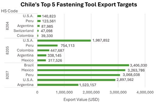 Similarly, Mexico and Brazil were also the top two importers and exporters in the HS 8205 category (Other hand tools, blow torches, etc.) and HS 8207 (Interchangeable tools for hand tools, whether or not power-operated, or for machine tools). For HS 8205, Chile ranks third in both imports and exports, while for HS 8207, Peru is the third largest importer and Chile the third largest exporter. The data for the first three to four months of 2025 show that Mexico and Brazil remained the top two importers and exporters in HS 8204 and HS 8205 categories.
