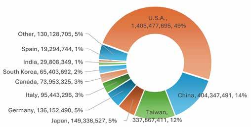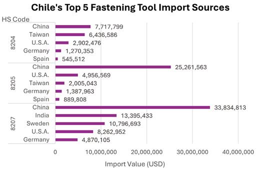 2. Chile imported at least 48% from mid-to-high-end fastener manufacturing countries, at least 39% from Asia, and at least 10% from Europe.