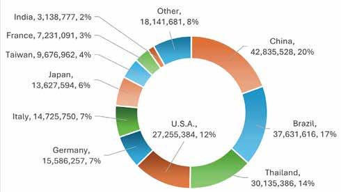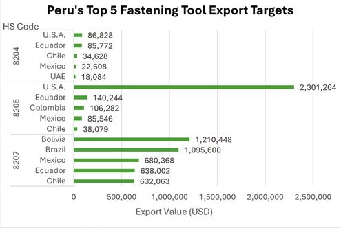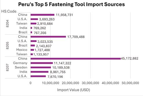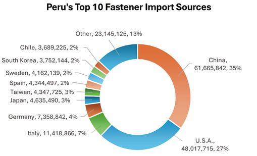 2. Peru imported at least 50% from mid-to-high-end fastener manufacturing countries, at least 43% from Asia, and at least 15% from Europe.