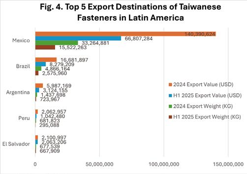 Taiwan’s fastener exports to Latin America are primarily export-driven and Taiwan imports only a small volume from the region, so this section analyzes the export aspect only. According to Table 3, Taiwan’s top 10 export destinations in Latin America in 2024, ranked by weight from the highest to the lowest, were: Mexico (USD 140.3 million in export value, 33,264.8 tons), Brazil (USD 16.6 million, 4,866.1 tons), Argentina (USD 5.9 million, 1,437.6 tons), Peru (USD 2.0 million, 681.8 tons), El Salvador (USD 2.1 million, 677.5 tons). In 2024, Taiwan’s total fastener exports to Latin America amounted to USD 181.6 million by value and 45,533.4 tons by weight. In the first half of 2025, exports totaled USD 88.0 million and 21,972.7 tons. Based on this, the export weight and value in 2025 might decline by about 3% compared to 2024. Figure 3 highlights that Taiwan’s fastener exports to Mexico alone accounted for 38% of its total export weight to Latin America—6.8 times the weight exported to Brazil (5%). This substantial gap emphasizes Mexico’s critical role as Taiwan’s most important export market in the region.