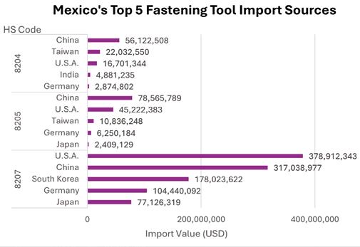 1. The proportion of wrenches (HS 8204) imported by Mexico from China was much higher than those imported from Taiwan and the United States, indicating that Mexico was highly dependent on Chinese wrenches. A similar phenomenon also occurred in category 8205.