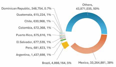 Table 4 ranks the top 15 Latin American countries by their fastening tool import values for 2024 from the highest to the lowest. The top five were: Mexico (USD 1.5 billion in imports and USD 233.1 million in exports), Brazil (USD 451.8 million in imports and USD 150.9 million in exports), Peru (USD 159.8 million in imports and USD 10.3 million in exports), Chile (USD 157.9 million in imports and USD 25.2 million in exports), Argentina (USD 140.4 million in imports and USD 364,634 in exports). Mexico accounted for approximately 54.7% of the combined import value among the top 15 countries, which was 3.3 times (refer to Figure 5) larger than Brazil’s 16.1% share and 9.5 times Peru’s 5.7% share. This significant margin confirms Mexico’s dominant position in the fastening tools import market within the region. On the export side, Mexico controlled about 52.9% of the total, 1.5 times (refer to Figure 6 ) Brazil’s 34.2%, 9.2 times Chile’s 5.7%, and 22.5 times Peru’s 2.3% share. In short, Mexico occupied over half of both import and export markets for fastening tools in Latin America, with Brazil taking between 10% and 30%.