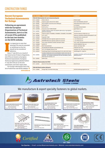 CONSTRUCTION FIXINGS Recent European Technical Assessments for fixings Following an agreement with the European Organisation of Technical Assessments, here is a list of recent ETAs published in the last two months on the EOTA website.