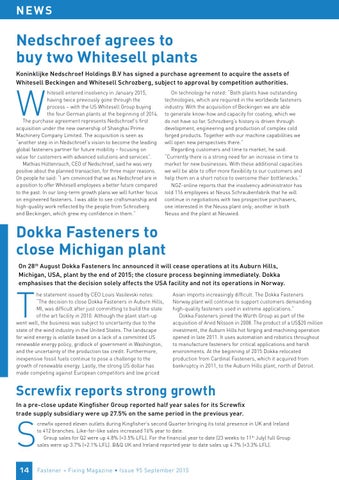 hitesell entered insolvency in January 2015, having twice previously gone through the process – with the US Whitesell Group buying the four German plants at the beginning of 2014. The purchase agreement represents Nedschroef’s first acquisition under the new ownership of Shanghai Prime Machinery Company Limited. The acquisition is seen as “another step in in Nedschroef’s vision to become the leading global fasteners partner for future mobility – focusing on value for customers with advanced solutions and services”. Mathias Hüttenrauch, CEO of Nedschroef, said he was very positive about the planned transaction, for three major reasons. On people he said: “I am convinced that we as Nedschroef are in a position to offer Whitesell employees a better future compared to the past. In our long-term growth plans we will further focus on engineered fasteners. I was able to see craftsmanship and high-quality work reflected by the people from Schrozberg and Beckingen, which grew my confidence in them.”