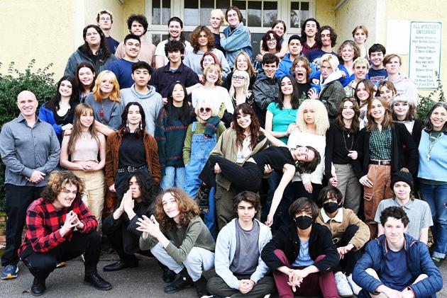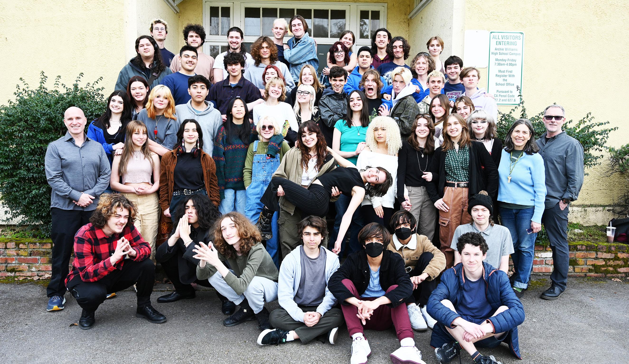 Jacob Carter, Ry Tibbs, Alex Baker, Emile Veyrac, Cyril Veyrac, Noah Price, and Tao Judnick. Second row, l to r: Greg Doherty (Teacher), Olivia Ramos, Percy Daunell, Zoe Tran, Ella Swain, Evajoy Sotnick holding Sasha Yovino, Kennedy Williams, Audrey Tucker, Faeryn Dunnigan, Jade Kelly, Francie Salle (teacher) and Morgan Paar (teacher). Third row, l to r: Natasha Barchuk, Carmen Sanchez, Polly Yurke, Jorge Castillo, Chase Foltz, Kate Lund, Maddie Barbee, Leonie Goffin, and Harper Miller. Fourth row, l to r: Indigo HerreraMeade, Angel Amador, Jake Witchel, Milan Wood, Bella Faye, Sebastian Calderon-Jensen, Wiley Raffael, Achilles Das, Kino Redfeild, and Cole Cortright. Fifth row, l to r: Luka Rebours, Oliver Valerio, Miles Franklin, Cole LaRoche, Joe Ardigo, Tony Heffernan, Abby Cochran, Izzi Lipari-Maxson, Elias Garcilazo, Lucas Nerelli, Oliver John, Miles Owens, Claire Kersell, Liam Bouyad. Not pictured: Miles Lavoie, Jac Craig, Wyeth Eberlein.