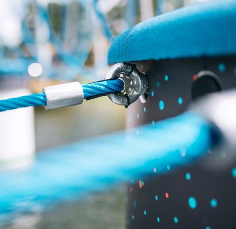 The Aqua Chimp ropes course consists of a solid steel framework with connections both above and below the water, as well as large floats made of durable HDPE plastic. In between the individual steel uprights –called Poles – the modular climbing features are installed.