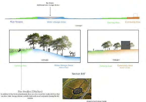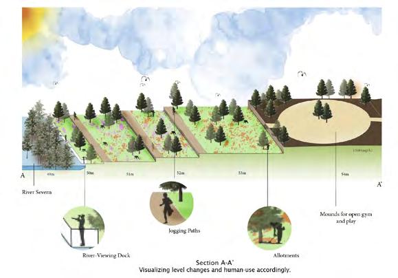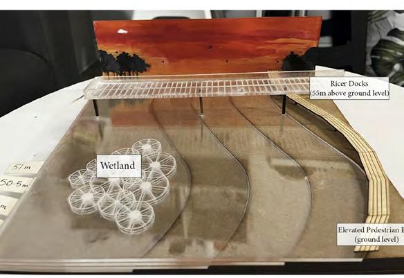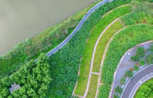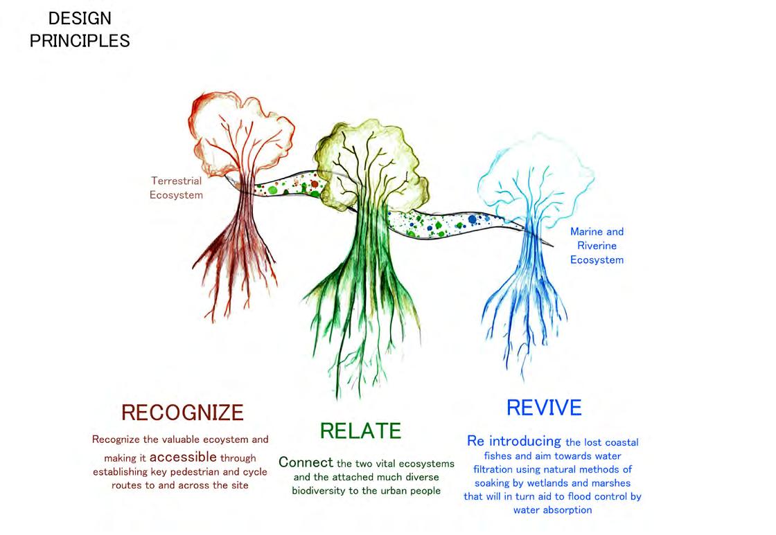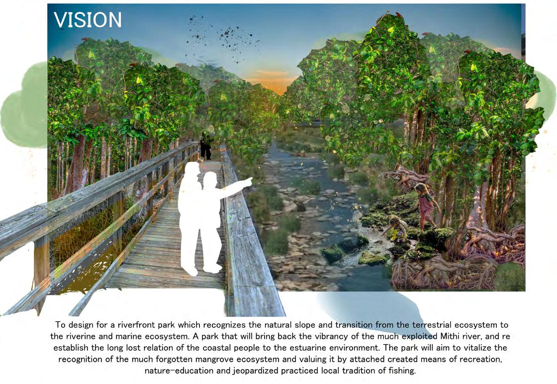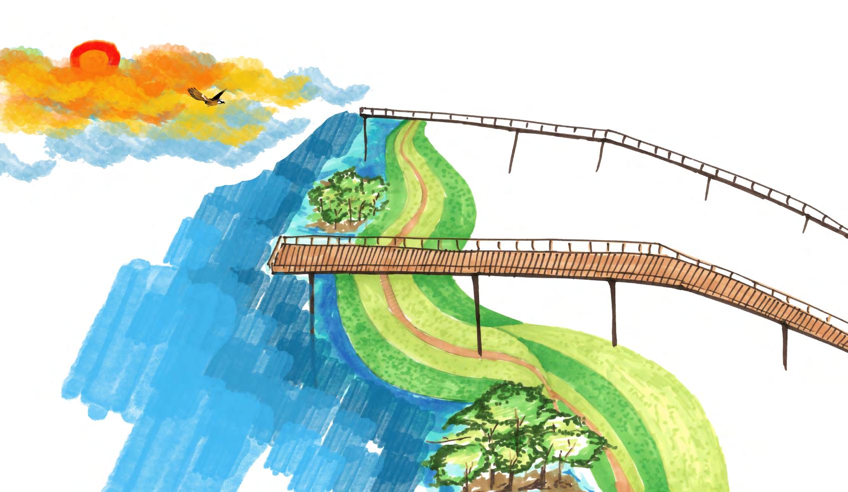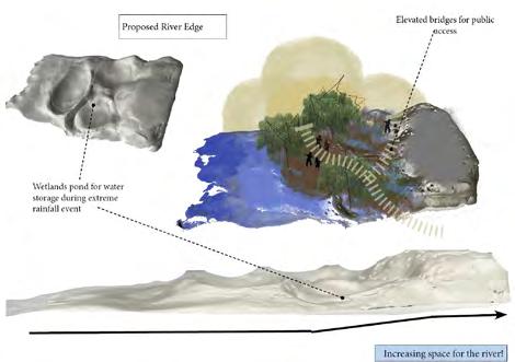 -Resilient bridge and paths system to adapt to the dynamic water -River currents, the flow of people, and the gravity of objects are all woven together to form a dynamic concord. -Meandering vegetated terraces, curvilinear paths, a serpentine bridge, circular bio-swales and planting beds