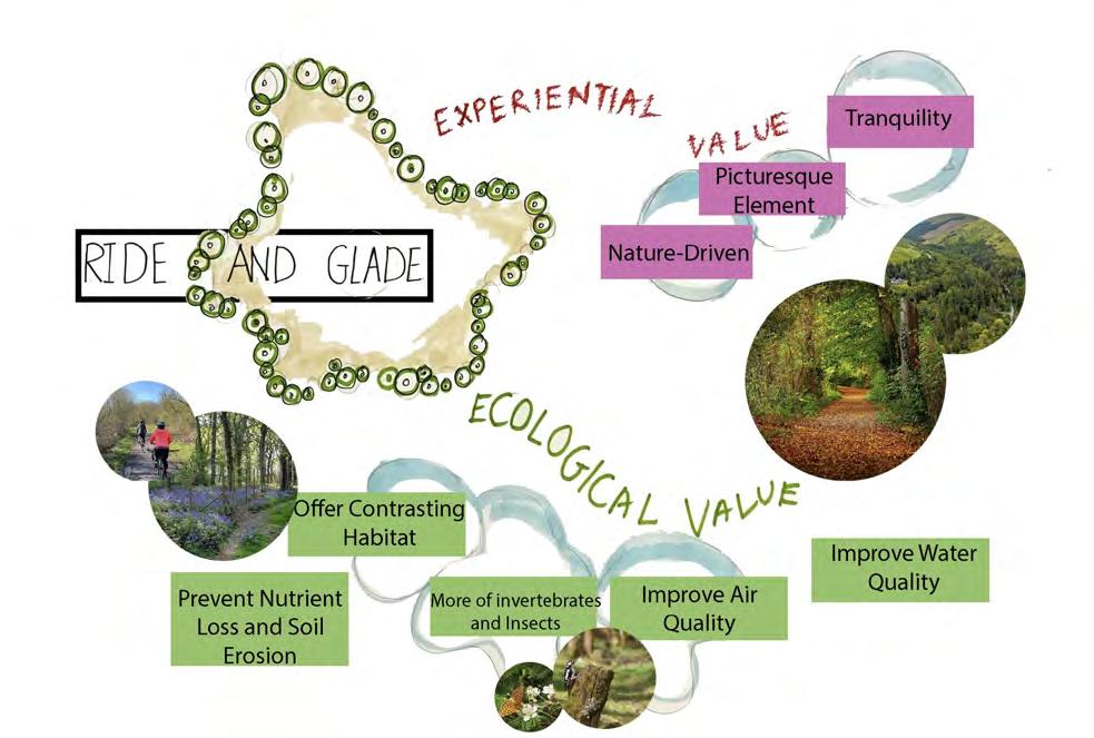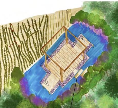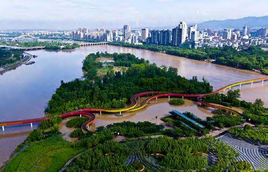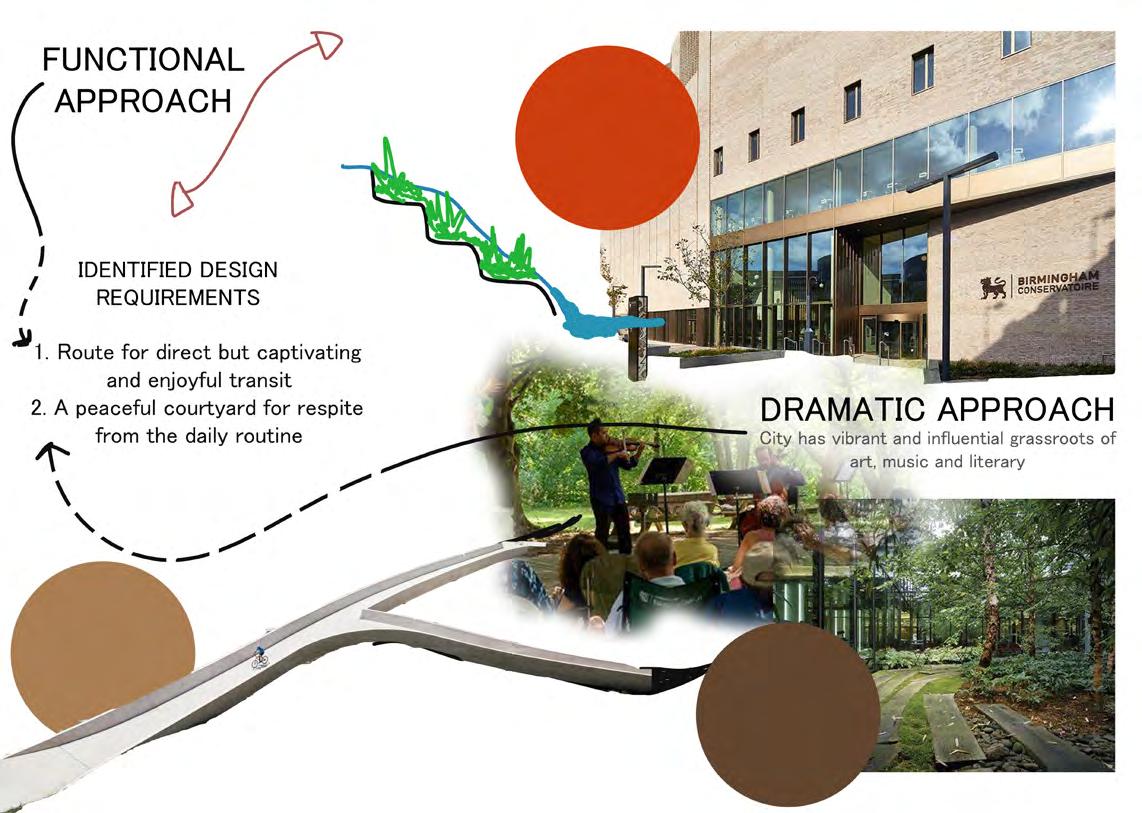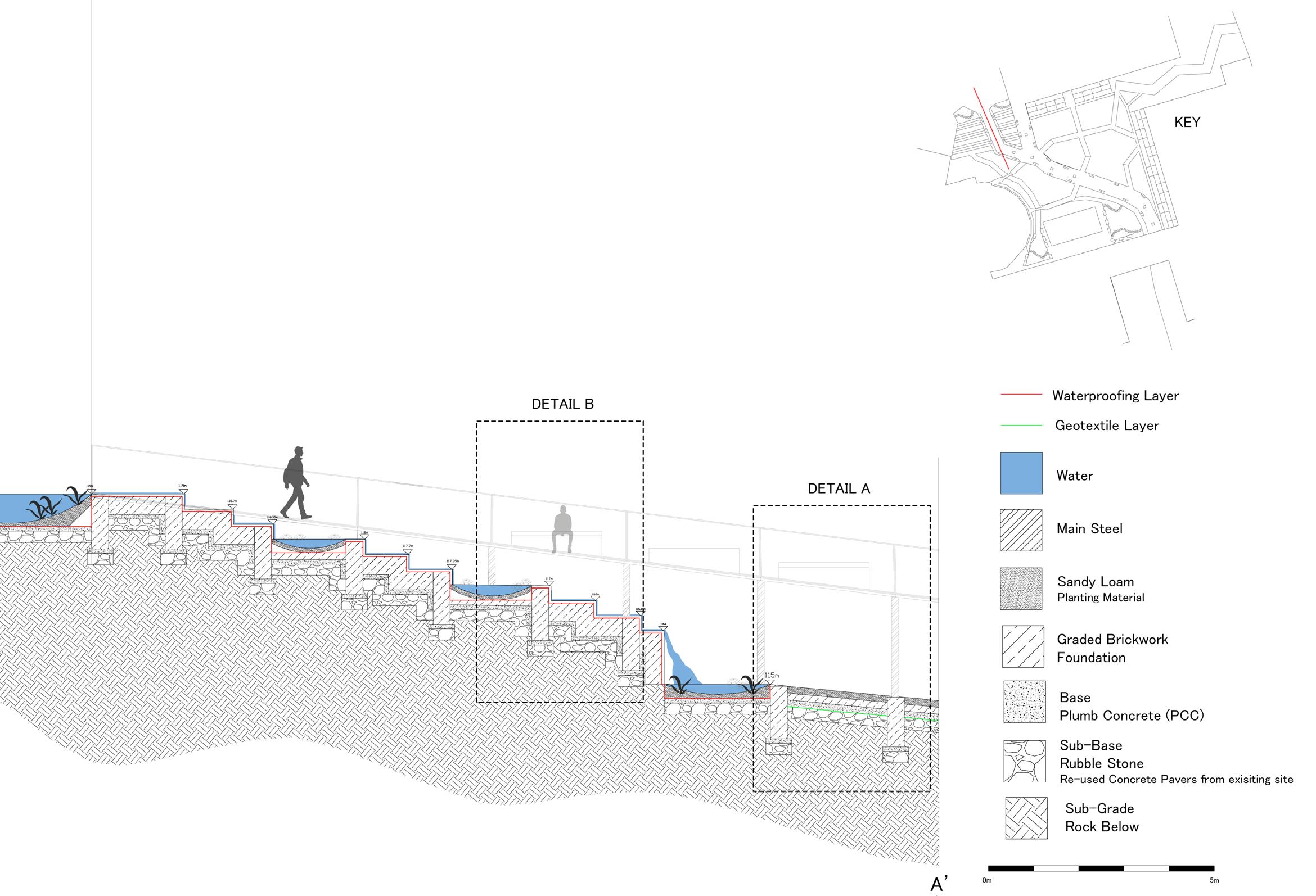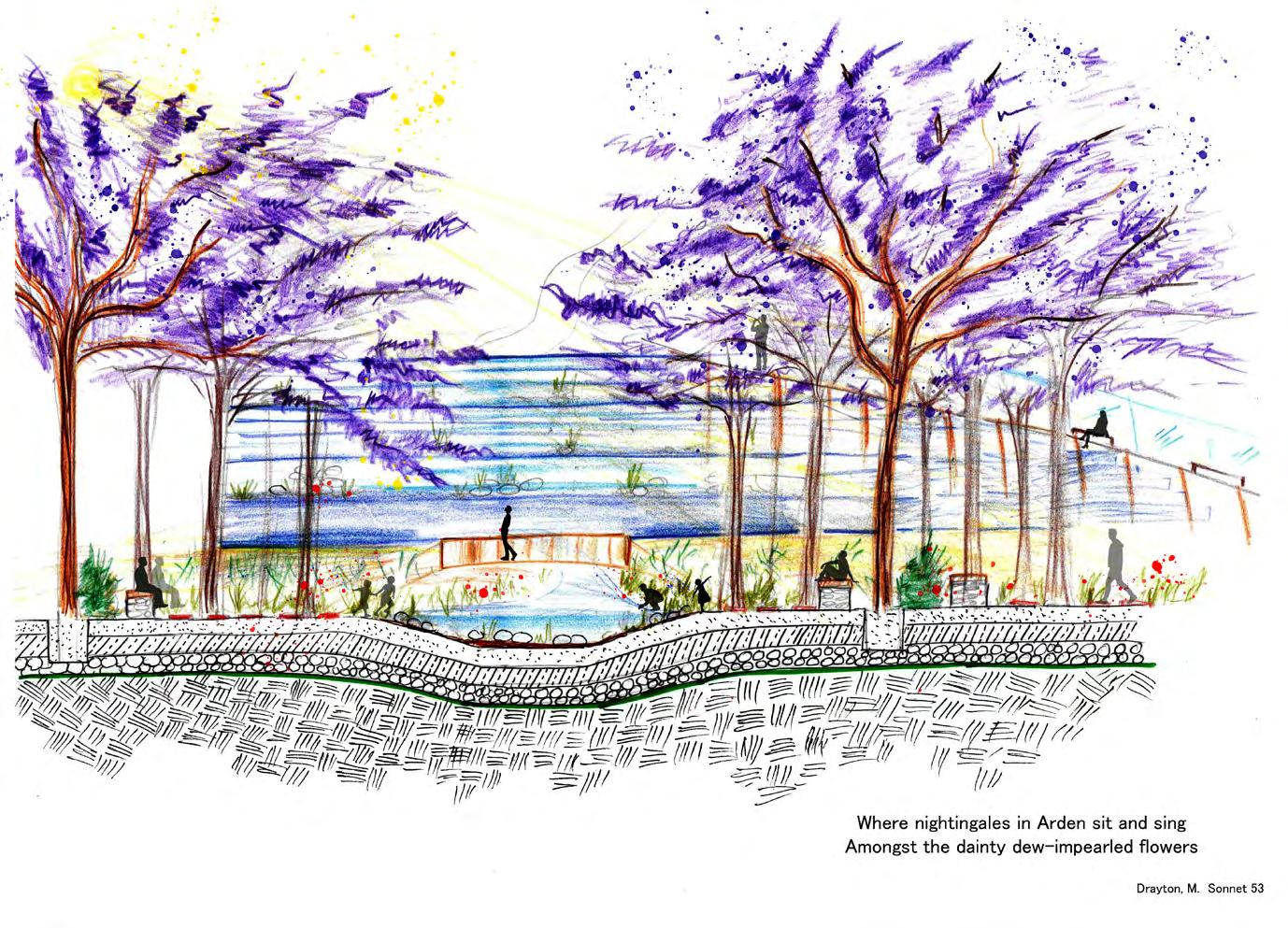 -Resilient bridge and paths system to adapt to the dynamic water -River currents, the flow of people, and the gravity of objects are all woven together to form a dynamic concord. -Meandering vegetated terraces, curvilinear paths, a serpentine bridge, circular bio-swales and planting beds