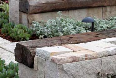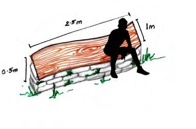 Bench Seats Recycled concrete pavers used as a base with a larch wood slat of 150mm thickness for seating on top.